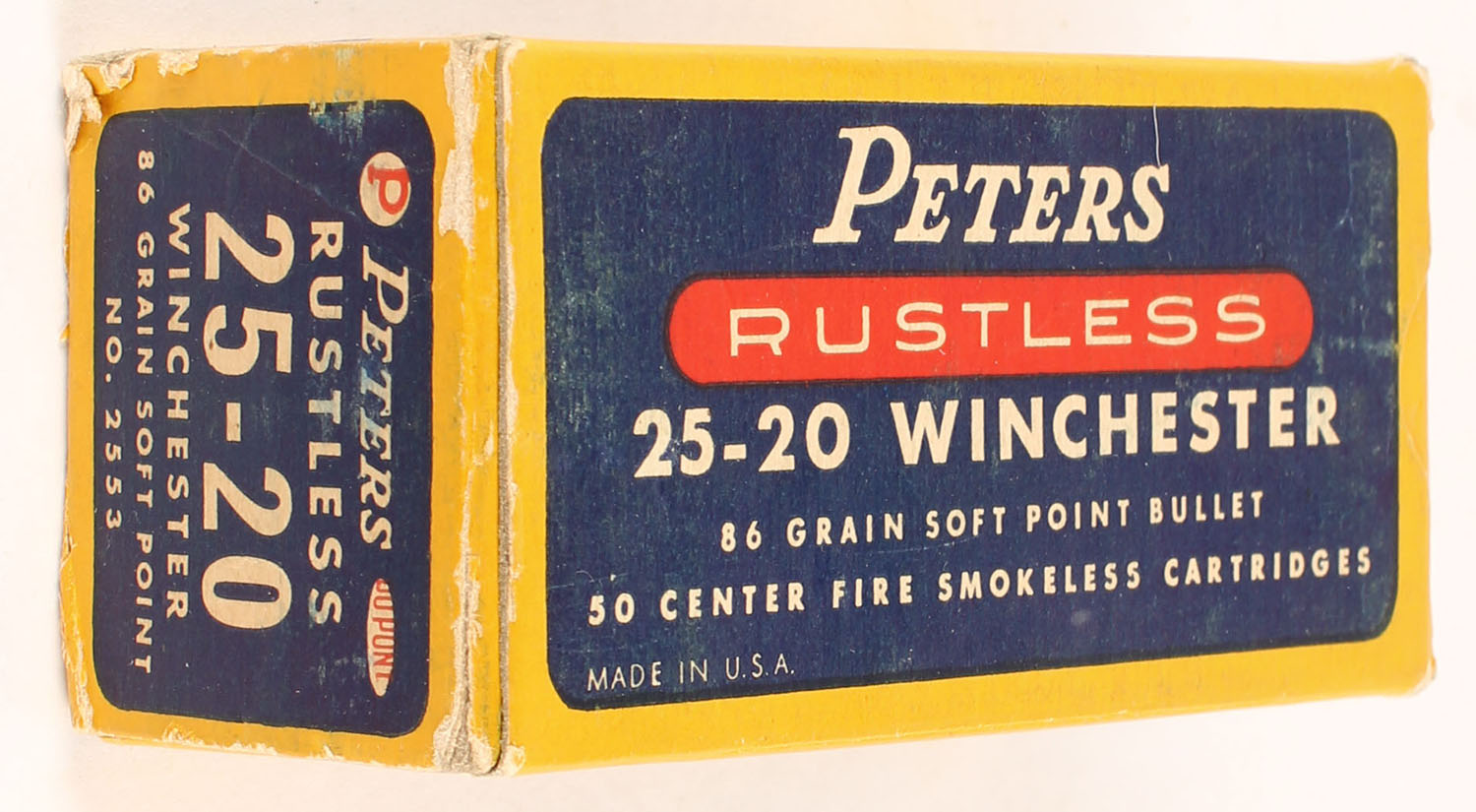 Peters, Rustless, .25-20 Winchester, 86 Grain Soft Point Bullet, Full, 1pc. Blue yellow & red box, box is solid with excellent color, minor shelf & corner wear, edges are mostly crisp, end flaps are solid, ammo is excellent. Grade: Excellent - Value: 120 to 180