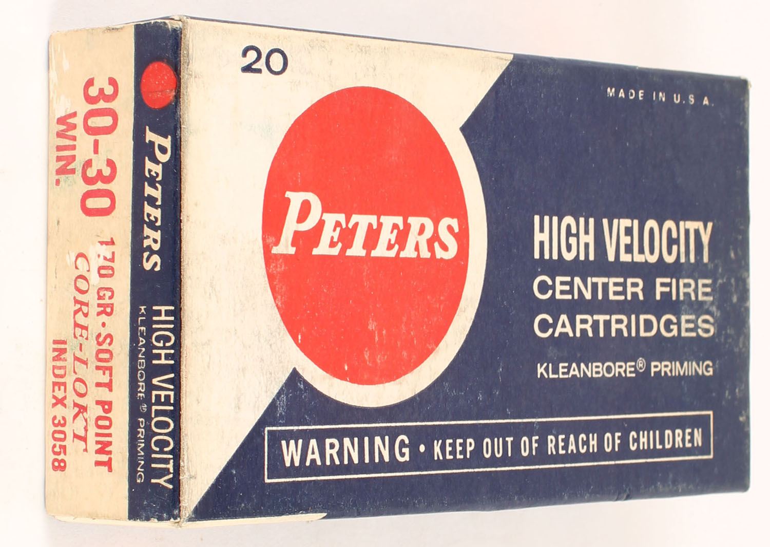 Peters, High Velocity, .30-30 Winchester, 170 Grain Core-Lokt Soft Point, Full, 1pc. Blue white & red box, box is solid with very good to excellent color, some shelf wear, corners are mostly sharp, edges are crisp, end flaps are solid, ammo is excellent. Grade: Excellent - Value: 20 to 30