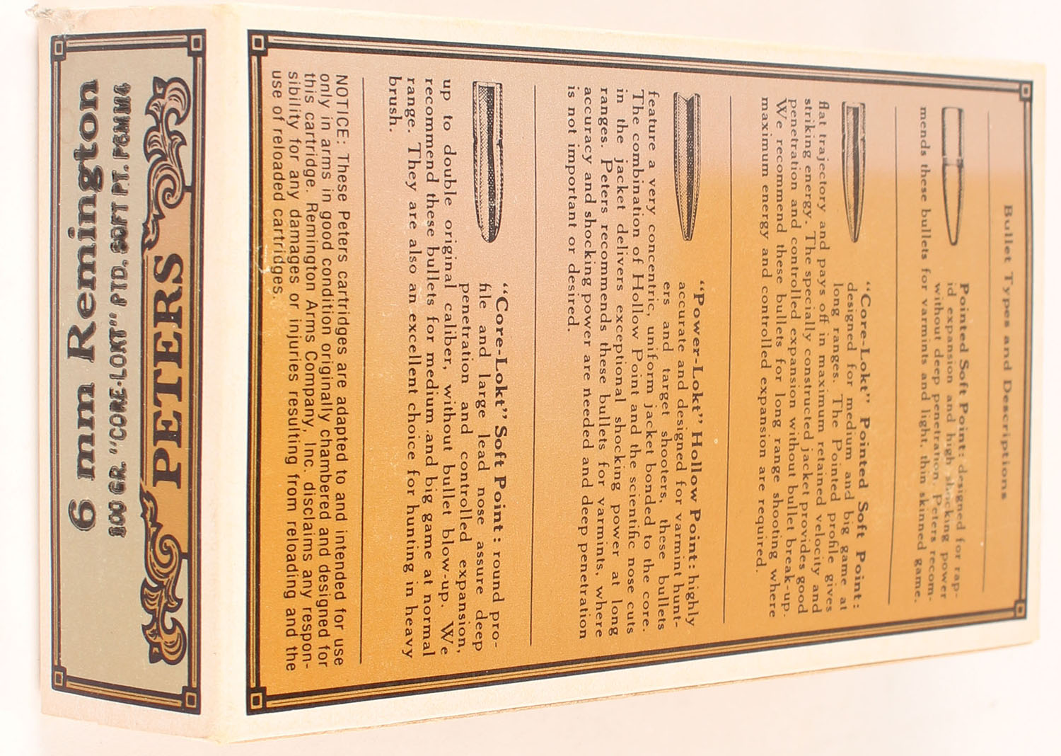 Peters, High Velocity Center Fire Cartridges, 6mm Remington, 100 Grain Core-Lokt Pointed Soft Point, Full, 1pc. Blown & black box, box is solid with very good color, color fading, corners are mostly sharp, edges are mostly crisp, end flaps are solid, ammo is excellent. Grade: Very Good ++ - Value: 40 to 60