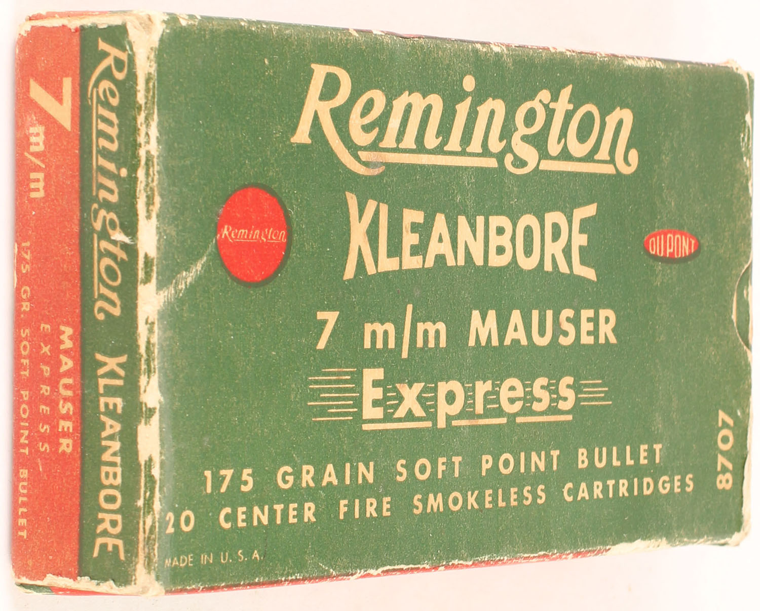 Remington, Kleanbore Express, 7mm Mauser, 175 Grain Soft Point Bullet, Full (10rds. Correct, 10rds. Incorrect), 1pc. Green buff & red box, box is solid with very good color, some age soiling, some edge & corner wear, end flaps are solid, ammo is very good. Grade: Very Good + - Value: 16 to 24
