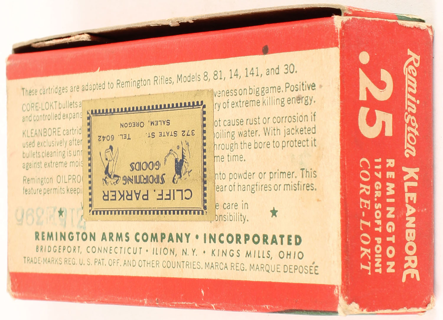 Remington, Kleanbore Express, .25 Remington, 117 Grain Soft Point Core-Lokt Bullet, Full, 1pc. Green buff & red box, box is solid with excellent color, some corner wear, very minor edge wear, end flaps are solid, factory seam has unadhered, end flaps are solid, ammo is excellent. Grade: Excellent - Value: 60 to 90