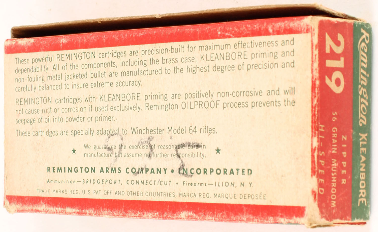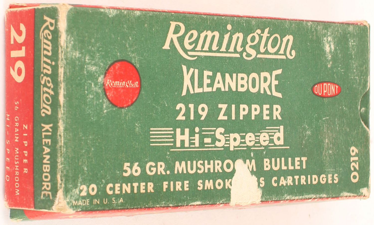 Remington, Kleanbore Hi-Speed, .219 Zipper, 56 Grain Mushroom Bullet, Partial 19rds., 1pc. Green buff & red box, box is solid with very good color, some shelf wear, scuff on top, some corner wear, minor edge wear, end flaps are solid, ammo is excellent. Grade: Very Good ++ - Value: 80 to 120