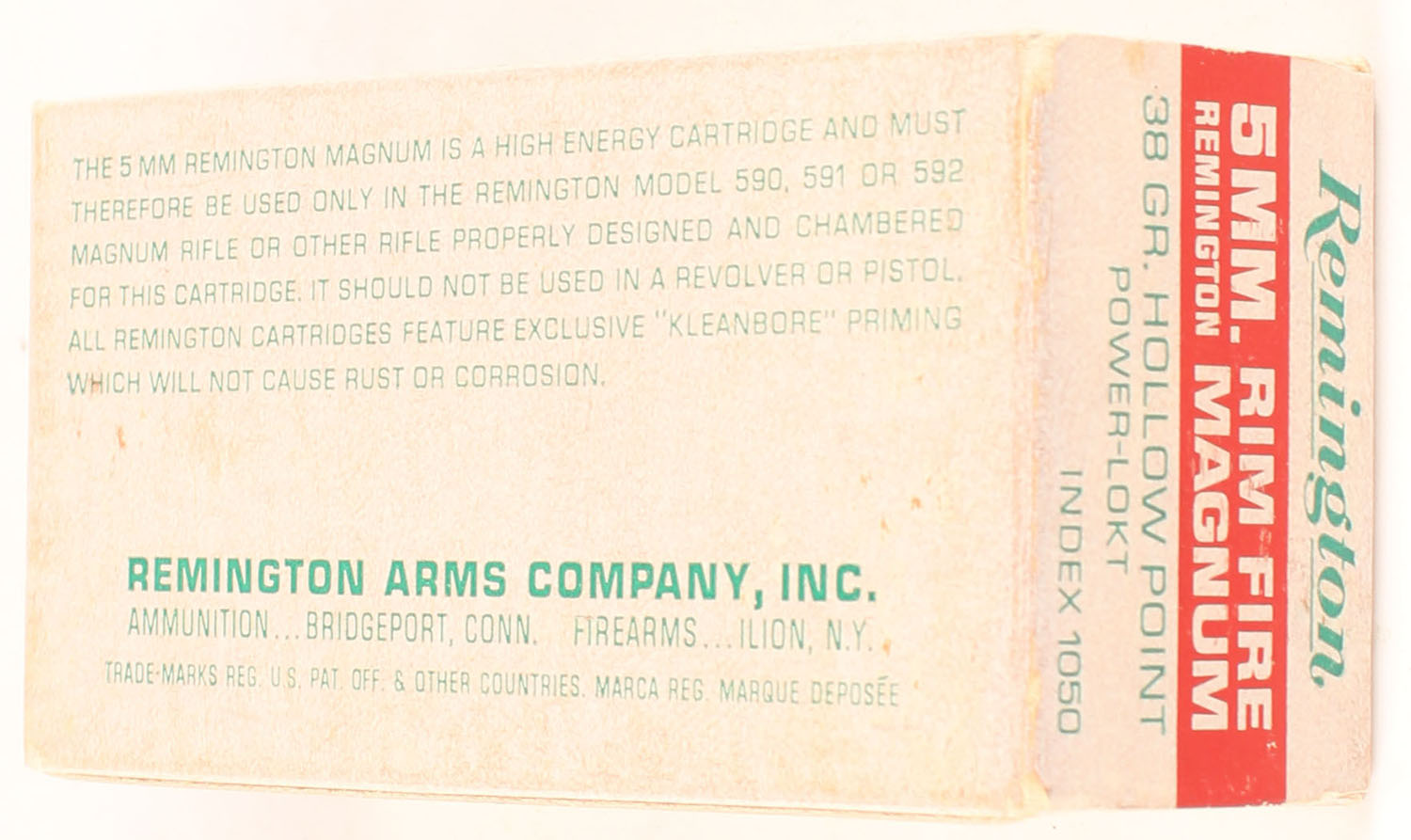 Remington, Hi-Speed, 5mm Remington Rim Fire Magnum, 38 Grain Hollow Point Power-Lokt, Full, 1pc. White red & green box, box is very solid with excellent colors, corners are mostly sharp, end flaps are solid, ammo is minty. Grade: Excellent + - Value: 60 to 90