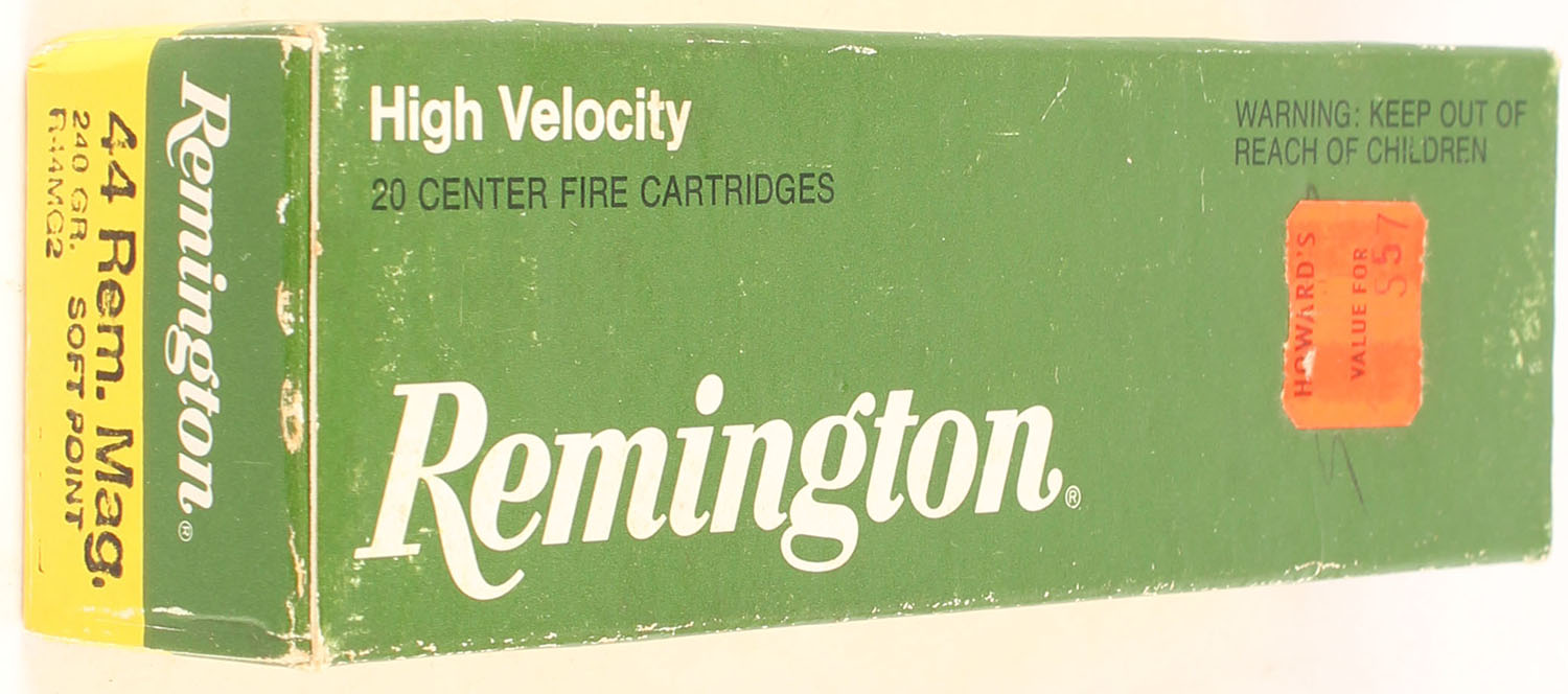 Remington, High Velocity, .44 Rem. Mag., 240 Gr. Soft Point, 1pc, Full, Green & yellow box with white/black print, box is solid with light scuffing & sticker to top, end flaps are solid, ammo is excellent. Grade: Excellent - Value: 24 to 36
