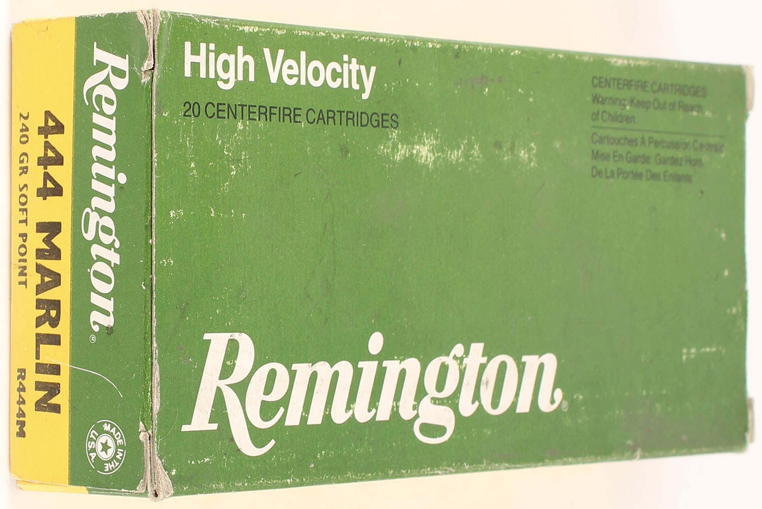 Remington High Velocity, 444 Marlin, 240 Grain Soft Point, Full, 1pc, Green & yellow box, box has some scuffing & minor edge wear, ammo is excellent. Grade: Very Good + - Value: 30 to 45