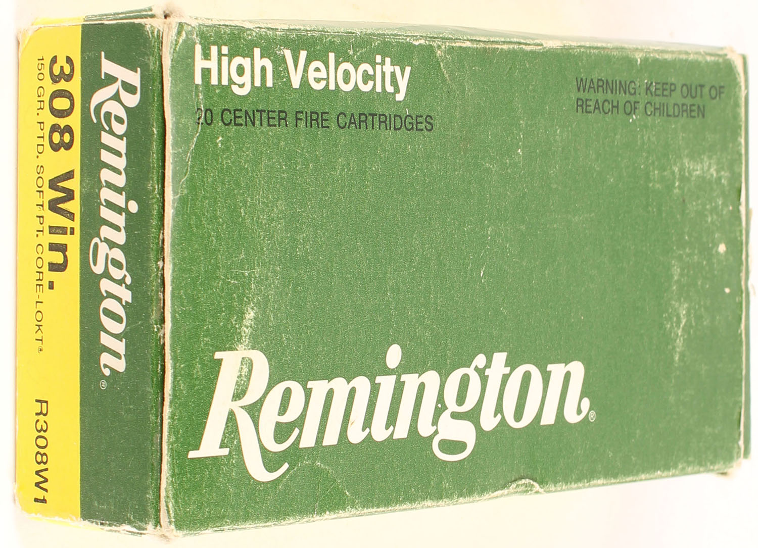 Remington, High Velocity, .308 Winchester, 150 Grain Pointed Soft Pt. Core-Lokt, Full, 1pc. Green yellow & white box, box has age soiling with edge & corner wear, end flaps are solid, ammo is excellent. Grade: Very Good ++ - Value: 20 to 30