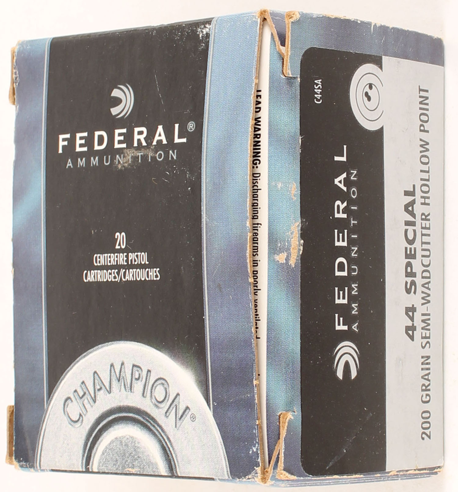 Federal, Champion, .44 Special, 200 Grain Semi-Wadcutter Hollow Point., Full, 1pc., multi-colored box, box is solid with some edge wear, end flaps are solid, ammo is excellent. Grade: Very Good - Value: 20 to 30