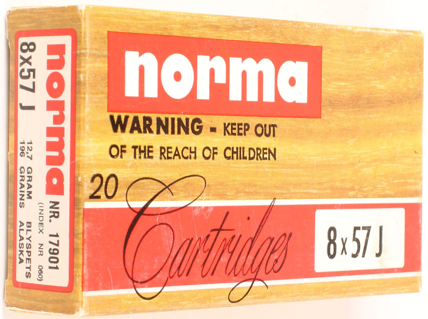 Norma, 8 x 57 J, 196 Grains, Full, 1pc., multi-colored box, box is very solid with excellent color, ammo is excellent. Grade: Excellent ++ - Value: 36 to 54