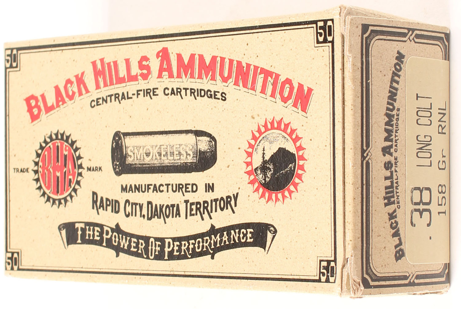 Black Hills, .38 Long Colt, 158 Grain RNL, Full, 1pc. multi-colored box, box is solid with excellent color, Ammo is excellent. Grade: Excellent - Value: 30 to 45