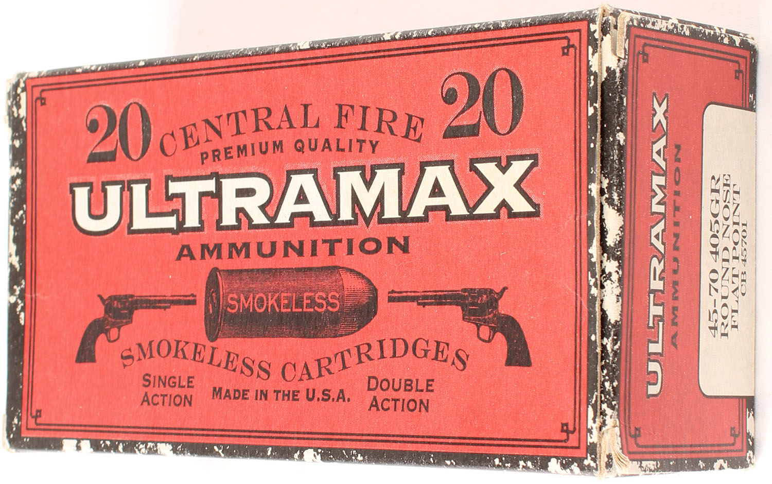 Ultramax, .45-70, 405 Grain RN Flat Point, Full, Black & red box with black & white print, box is solid with good color, has minor corner wear, ammo is very good. Grade: Excellent - Value: 30 to 45