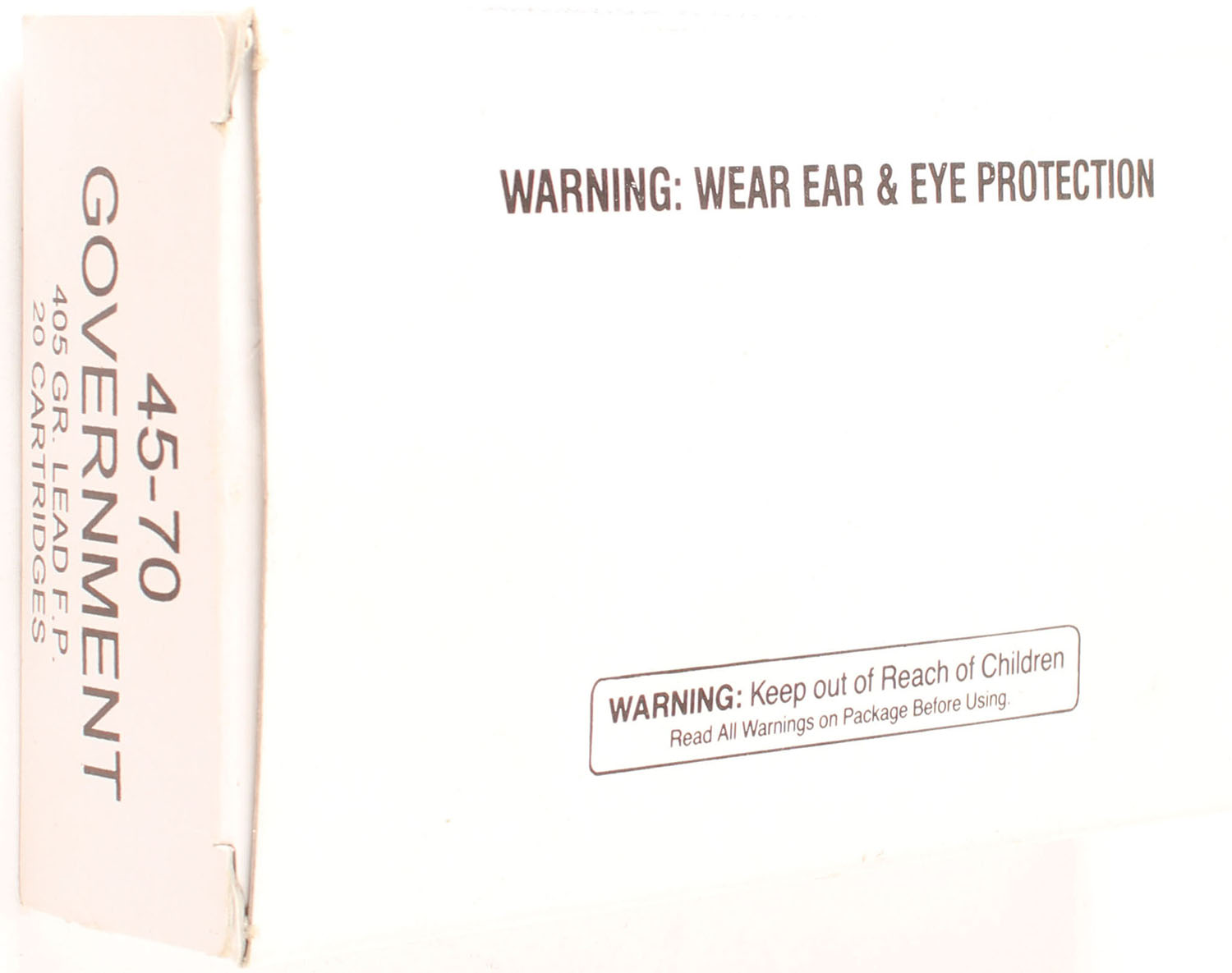 Unknown, Mfg., .45-70 Government, 405 Grain Flat Point, Full, 1pc, white box with black print, box is solid, ammo is excellent. Grade: Very Good ++ - Value: 16 to 24
