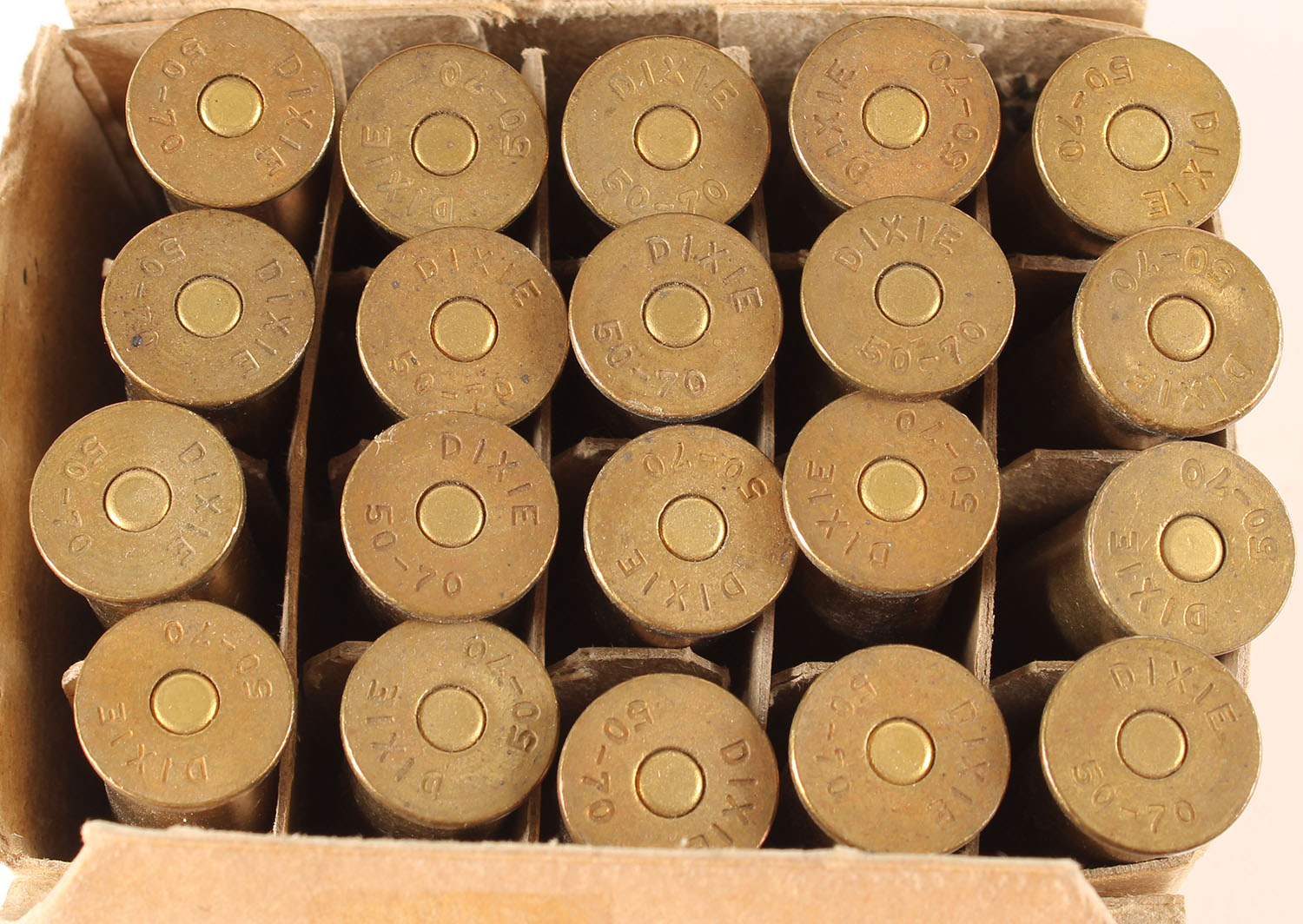 Unknown Mfg., .50-70, Full 20rds, 1pc, H/S: DIXIE 50-70, buff box with no label is solid, ammo is very good. Grade: Very Good - Value: 30 to 45