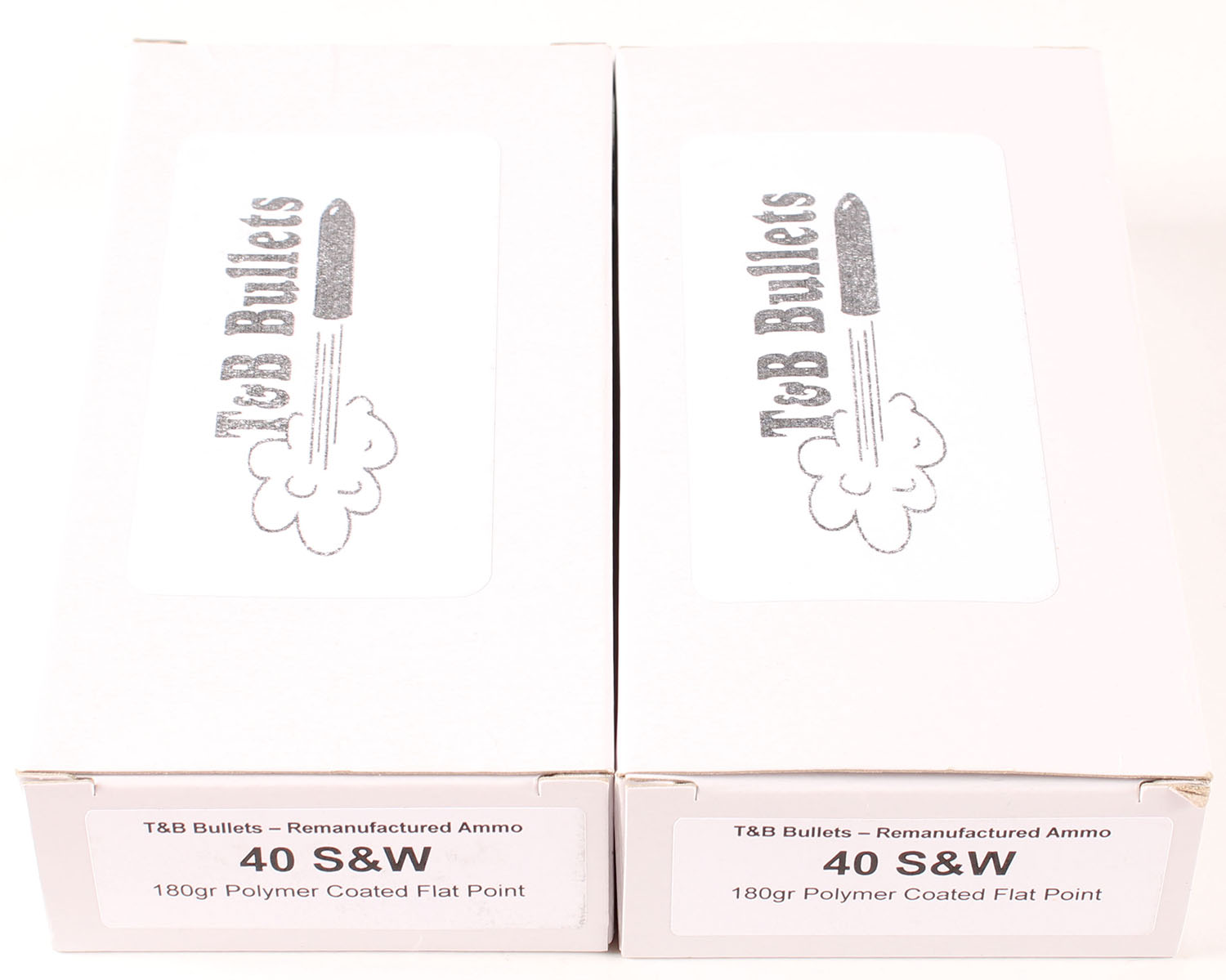 T&B Bullets, Lot of (2) .40 Smith & Wesson, Remanufactured Ammo by a class type 7 Ammo MFG (this is the same class (high quality) as Winchester, Federal and or CCI), 180 Grain Polymer Coated FP bullet, loaded cartridges, Full, 1pc, Mixed H/S, white boxes with black print, boxes are very solid, ammo is excellent. Grade: Excellent ++ - Value: 20 to 30
