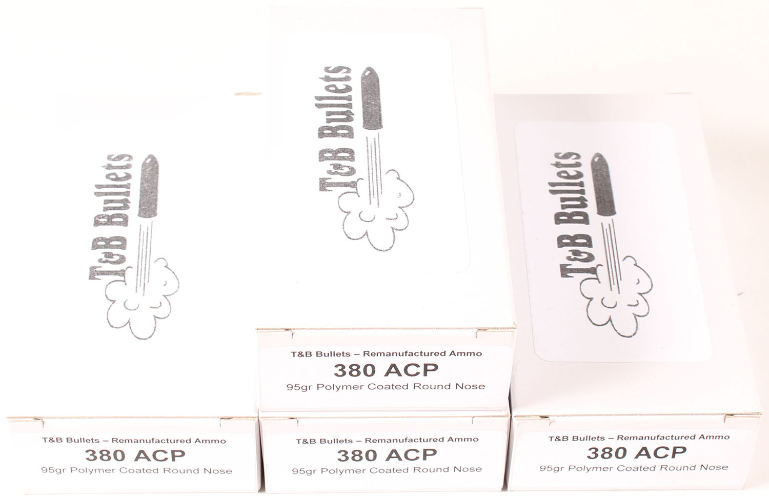 T&B Bullets, Lot of (4), .380 ACP, Remanufactured Ammo by a class type 7 Ammo MFG (this is the same class (high quality) as Winchester, Federal and or CCI), 95 Grain Polymer Coated Round Nose bullet, loaded cartridges, 1pc, Full 50 count boxes, white boxes are very solid, ammo is minty. Grade: Excellent ++ - Value: 30 to 45