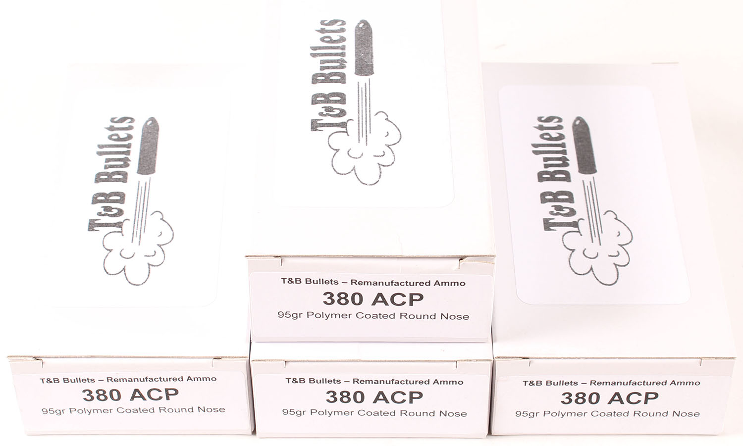 T&B Bullets, Lot of (4), .380 ACP, Remanufactured Ammo by a class type 7 Ammo MFG (this is the same class (high quality) as Winchester, Federal and or CCI), 95 Grain Polymer Coated Round Nose bullet, loaded cartridges, 1pc, Full 50 count boxes, white boxes are very solid, ammo is minty. Grade: Excellent ++ - Value: 30 to 45