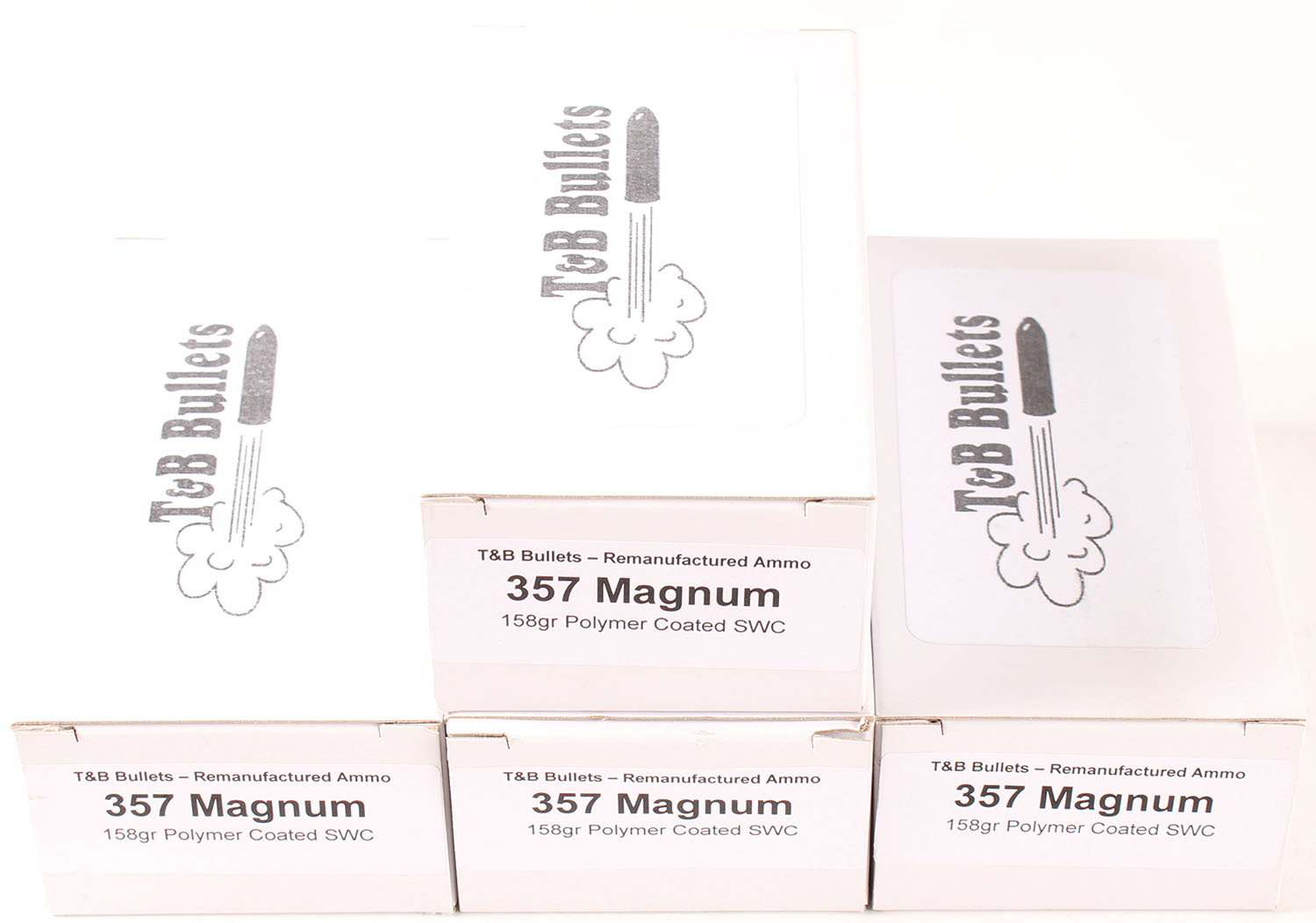 T&B Bullets, Lot of (4), .357 Magnum, Remanufactured Ammo by a class type 7 Ammo MFG (this is the same class (high quality) as Winchester, Federal and or CCI), 158 Grain Polymer Coated SWC bullet, loaded cartridges, 1pc, Full 50 count boxes, white boxes are very solid, ammo is minty. Grade: Excellent ++ - Value: 30 to 45