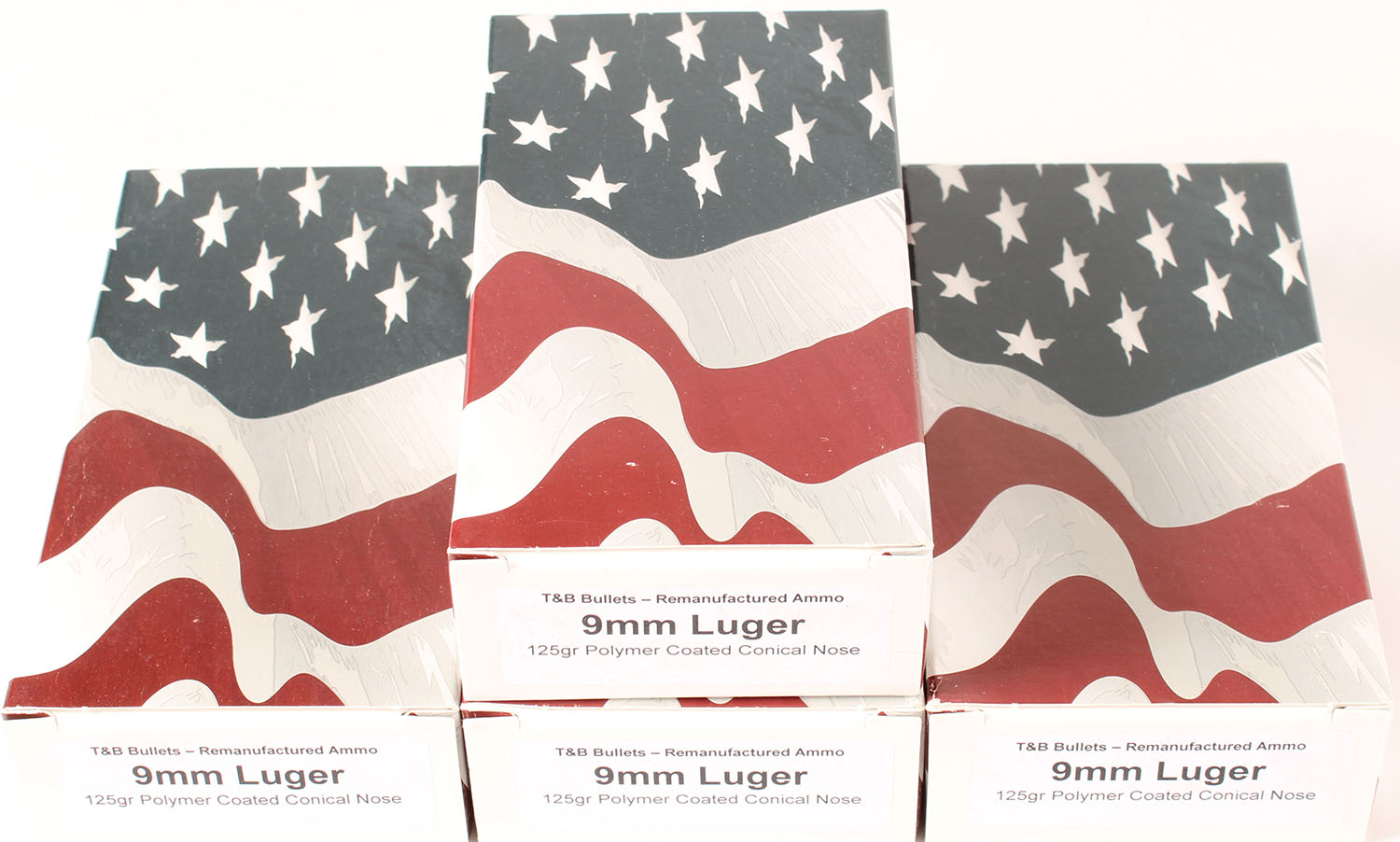T&B Bullets, 9mm Luger, Remanufactured Ammo by a class type 7 Ammo MFG (this is the same class (high quality) as Winchester, Federal and or CCI), 125 Grain Polymer Coated Conical Nose bullet, loaded cartridges, Full, 1pc, Multi-colored boxes are very solid, ammo is minty. Grade: Excellent ++ - Value: 30 to 45