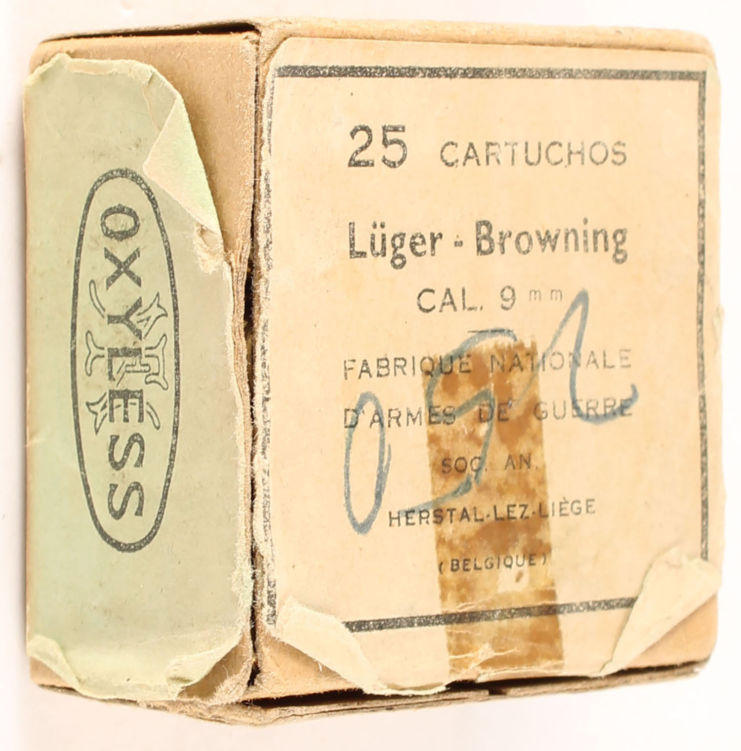 Fabrique Nationale D'Armes de Guerre, 9mm Luger, Full, 1pc, Buff box with buff & black label, box has age soiling & scuffing, ammo is very good. Grade: Good ++ - Value: 24 to 36