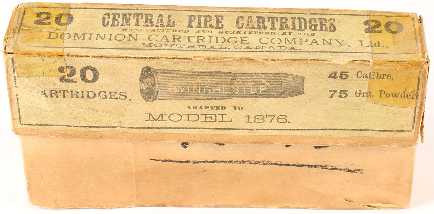 Northwest Mounted Police Contract - Dominion Cartridge Co. Central Fire Cartridges, .45-75 Winchester, Partial 14rds. (5 copper primers with correct bullet, 9 brass primers with incorrect bullet - all have correct H/S), This is an 1899 box with ammo that is dated as such with a 9 - 9 H/S, 2pc. Buff box with green label, box is solid with very good color, some age soiling & color fading, front has been written on, tape on both ends of lid, some edge & corner wear, label is intact, ammo varies from very good to excellent. Grade: Very Good - Value: 100 to 400