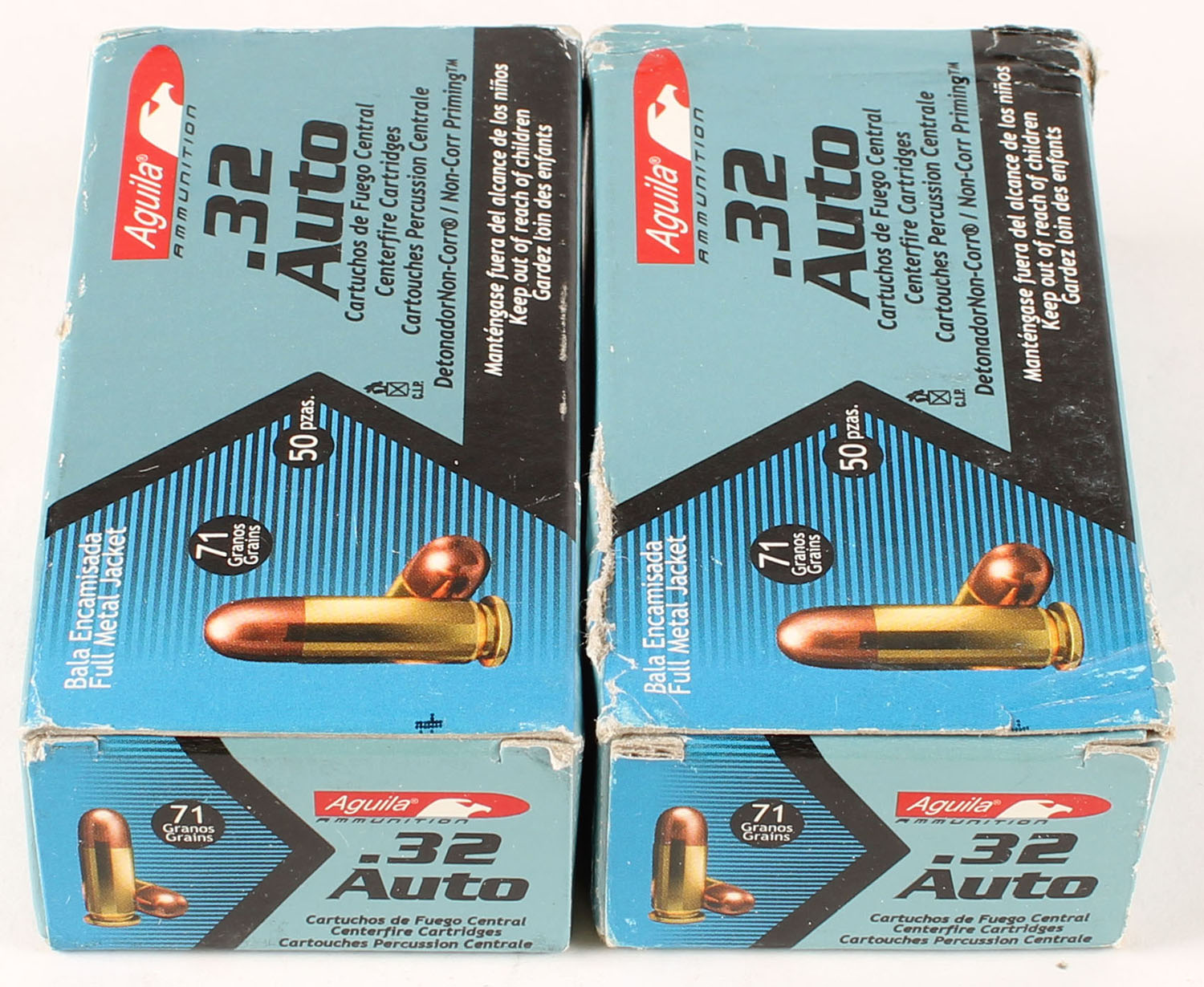 Aguila, Lot of (2), .32 Auto, 71 Grain, Full, 1pc, multi-colored boxes, boxes have light scuffing, ammo is excellent. Grade: Very Good ++ - Value: 30 to 45