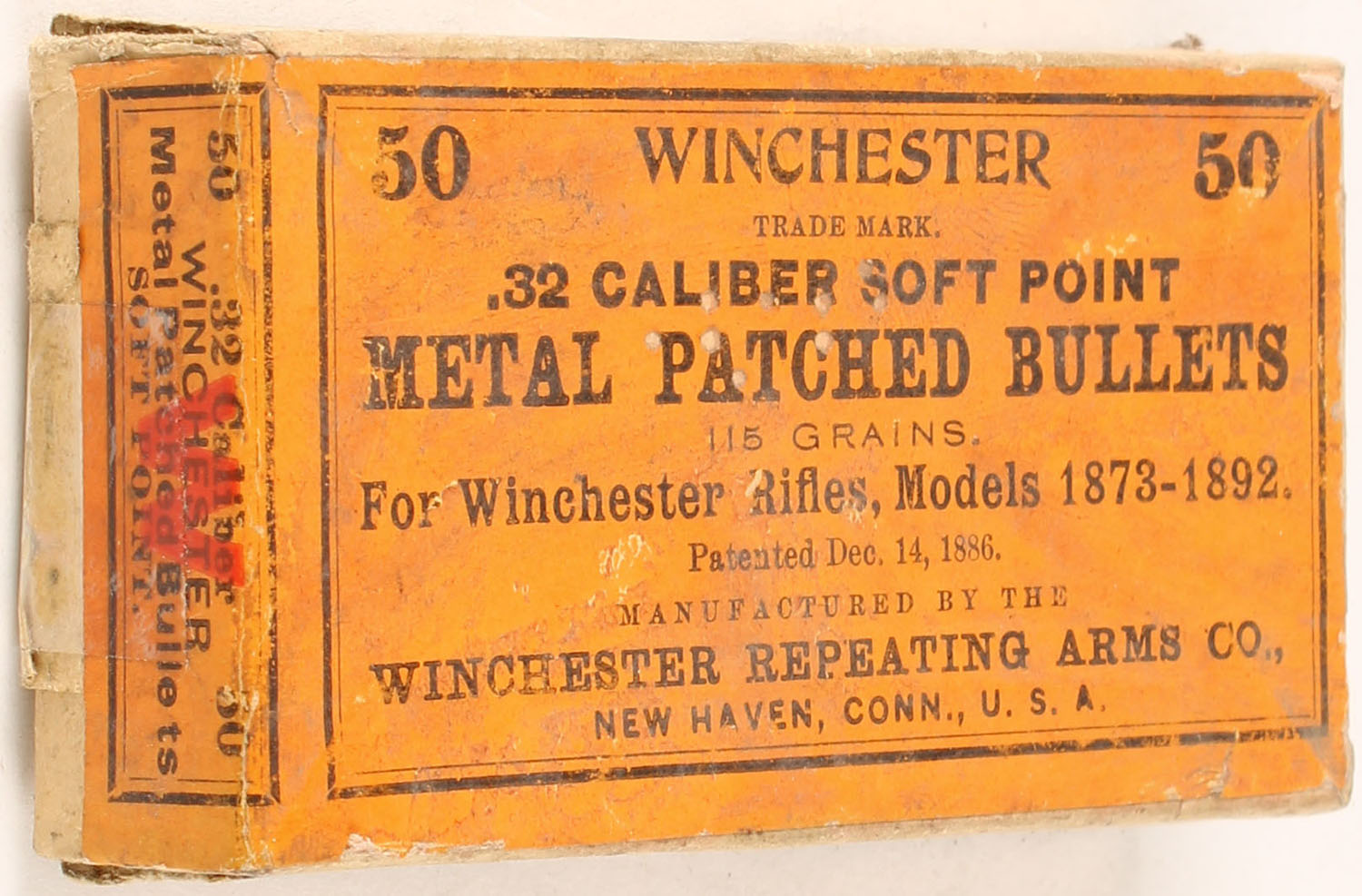 Winchester, .32 Cal., 115 Grains SP Metal Patched Bullets, Full, 2pc, Buff box with orange & black label, box has seam splits with tape repairs, has some scuffing, bullets are good. Grade: Very Good - Value: 40 to 60
