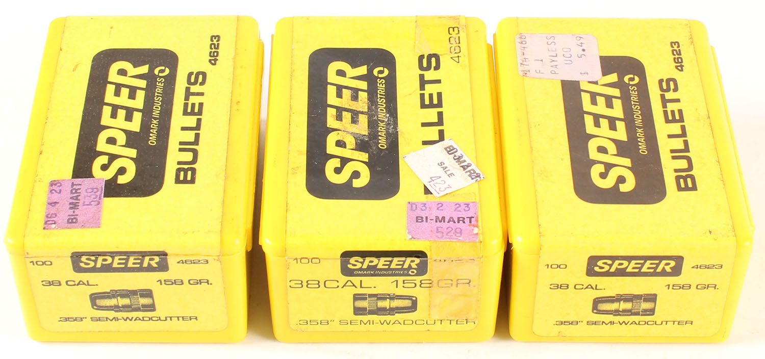 Speer, Lot of (3), .38 Cal., 158 Gr., Semi-Wadcutter, .358'', (2) Full, (1) FULL & SEALED, 1pc, Yellow & black plastic boxes, boxes are very solid, bullets are excellent. Grade: Excellent - Value: 24 to 36