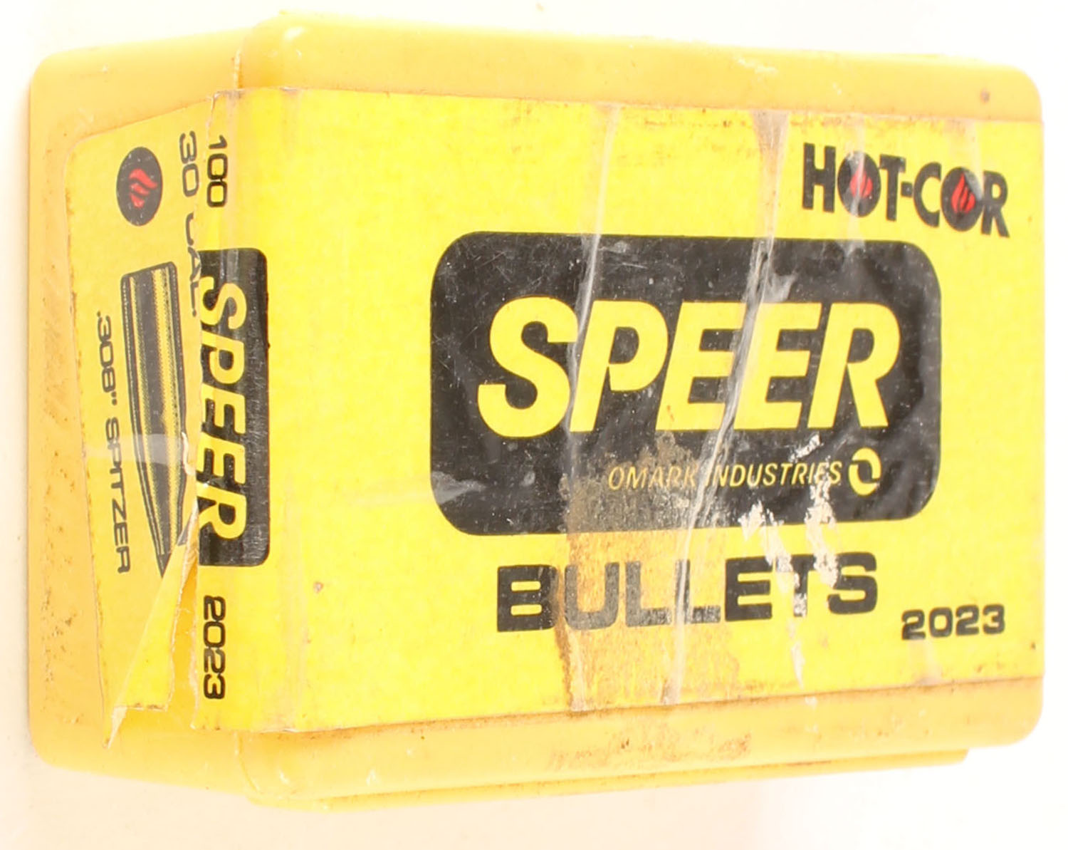 Speer, .30 Cal., 150 Grain RN, .308'' Spitzer, Appears 1/2 Full, Yellow & black plastic box, box has age soiling, bullets are very good. Grade: Good + - Value: 12 to 18