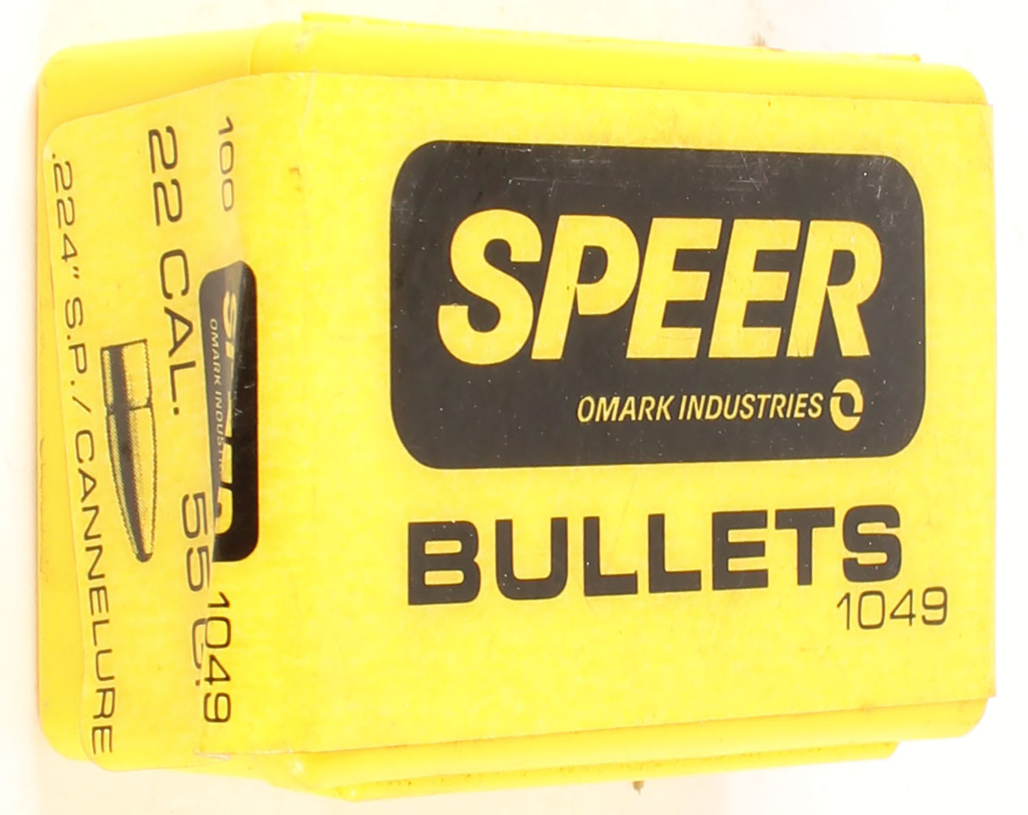 Speer, .22 Cal., 55 Grain, .224'' S.P./ Cannelure, FULL & SEALED, 1pc, Yellow plastic box with black & yellow label, box is solid. Grade: Excellent - Value: 16 to 24