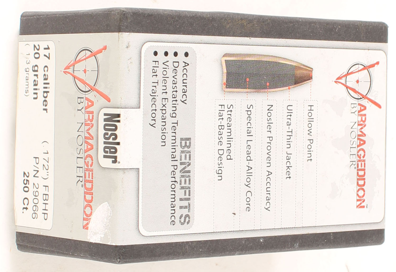 Nosler, Armageddon, .17 Cal. (.172''), 20 Grain, Appears Partial (1/2 Full), 2pc, black box with multi-colored label, box is very solid, bullets are excellent. Grade: Very Good ++ - Value: 20 to 30