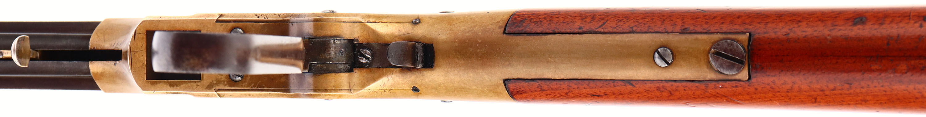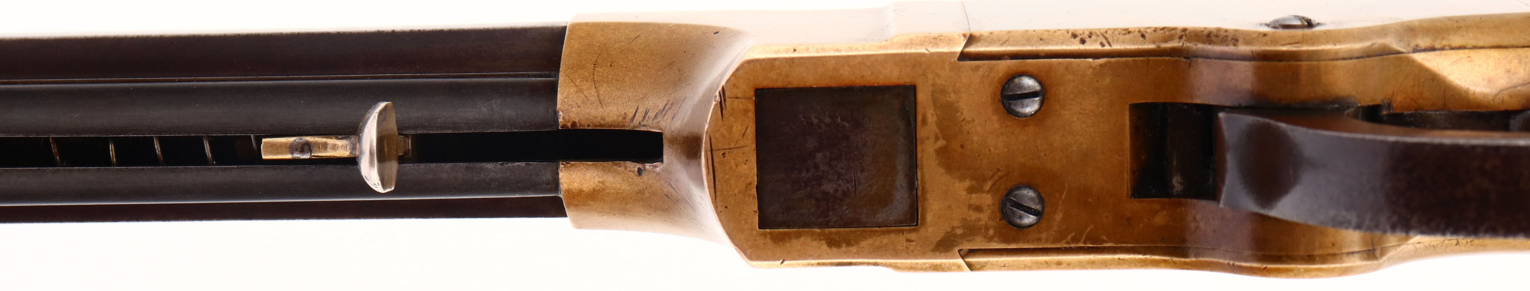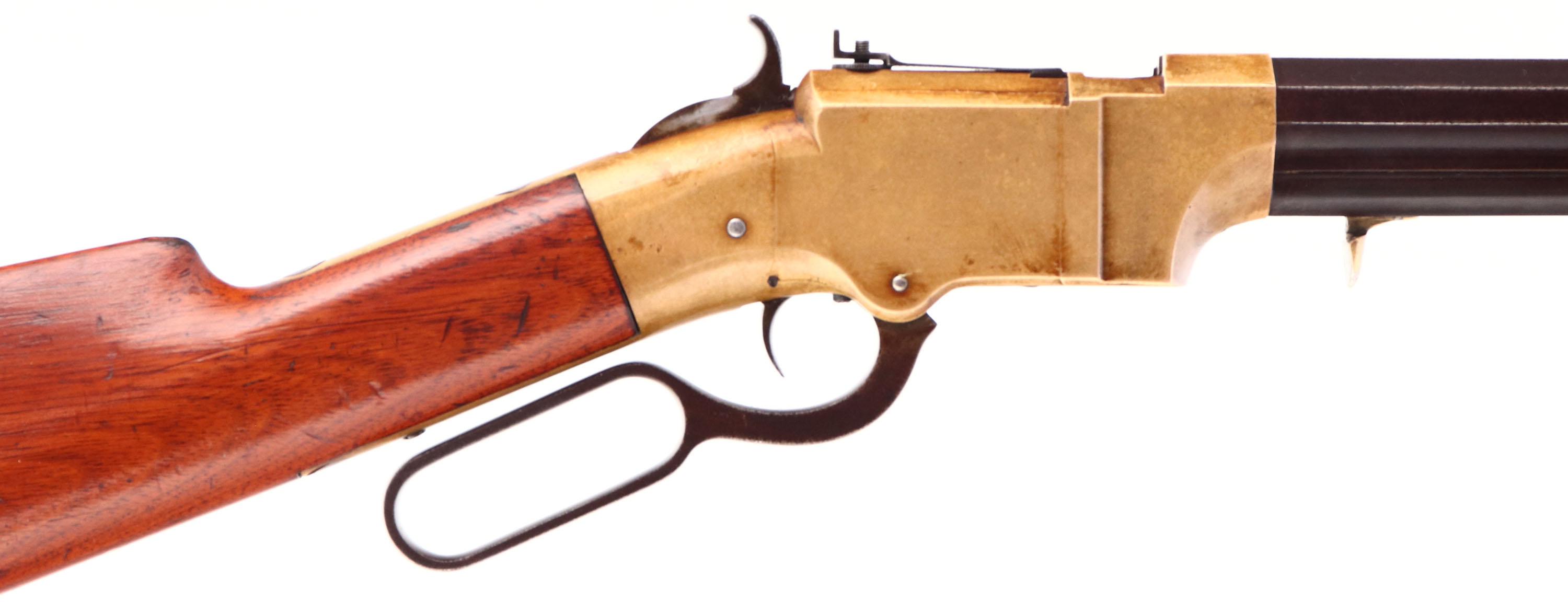FANTASTIC Volcanic Lever Rifle, .41 Volcanic., MFG. 1857, SN: 154, Lever Action Rifle. This Volcanic Lever Action Carbine was manufactured by the New Haven Arms Company c. 1857. The diminutive carbine has a 16 1/2-inch barrel with integral 20-shot magazine. The barrel has a nickel-silver front sight blade & blue finish, which has toned to a smooth & even plum brown patina. Some light pitting on the barrel. The top flat is stamped: ''NEW HAVEN CONN. PATENT FEB. 14. 1854'' in one line. The rifle has a brass receiver & crescent buttplate. The receiver has a dove-tail mounted rear sight, with thumb-wheel elevator. The rear sight, bolt & top of the cartridge elevator are fire blue. The hammer has deep, borderless, hand-cut knurling on the spur. The hammer, trigger,& lever are color casehardened. The straight grain, American walnut stock has a high polish varnished ''piano'' finish which remains very good, with minor scuffs, scrapes, & contusions. The serial number is stamped: (1) on the lower left side of the receiver tang, (2) the inside of the buttplate, and (3) shanks of the hand fitted buttplate and tang screws . All of the visible SN's match. Bore is good, with areas of pitting amongst strong rifling. The New Haven Arms Company manufactured approximately 1,000 carbines, with 16 1/2, 21 & 25-inch barrels, between 1857 & 1860. Volcanic carbines are rare & historically significant firearms. The revolutionary combination of ''rocket-ball'' primed cartridge, self-cocking toggle action & integral spring loaded magazine was a huge advance in firearms design. When combined with reliable rimfire & centerfire cartridges, the Volcanic action served as the basis for the Henry rifle & Winchester Model 1866, 1873 & 1876 rifles & carbines. This very early 3 digit SN example appears in excellent original condition & would certainly be the centerpiece of most historical gun collections. * Antique, No FFL Req. - Value: 45000 to 65000