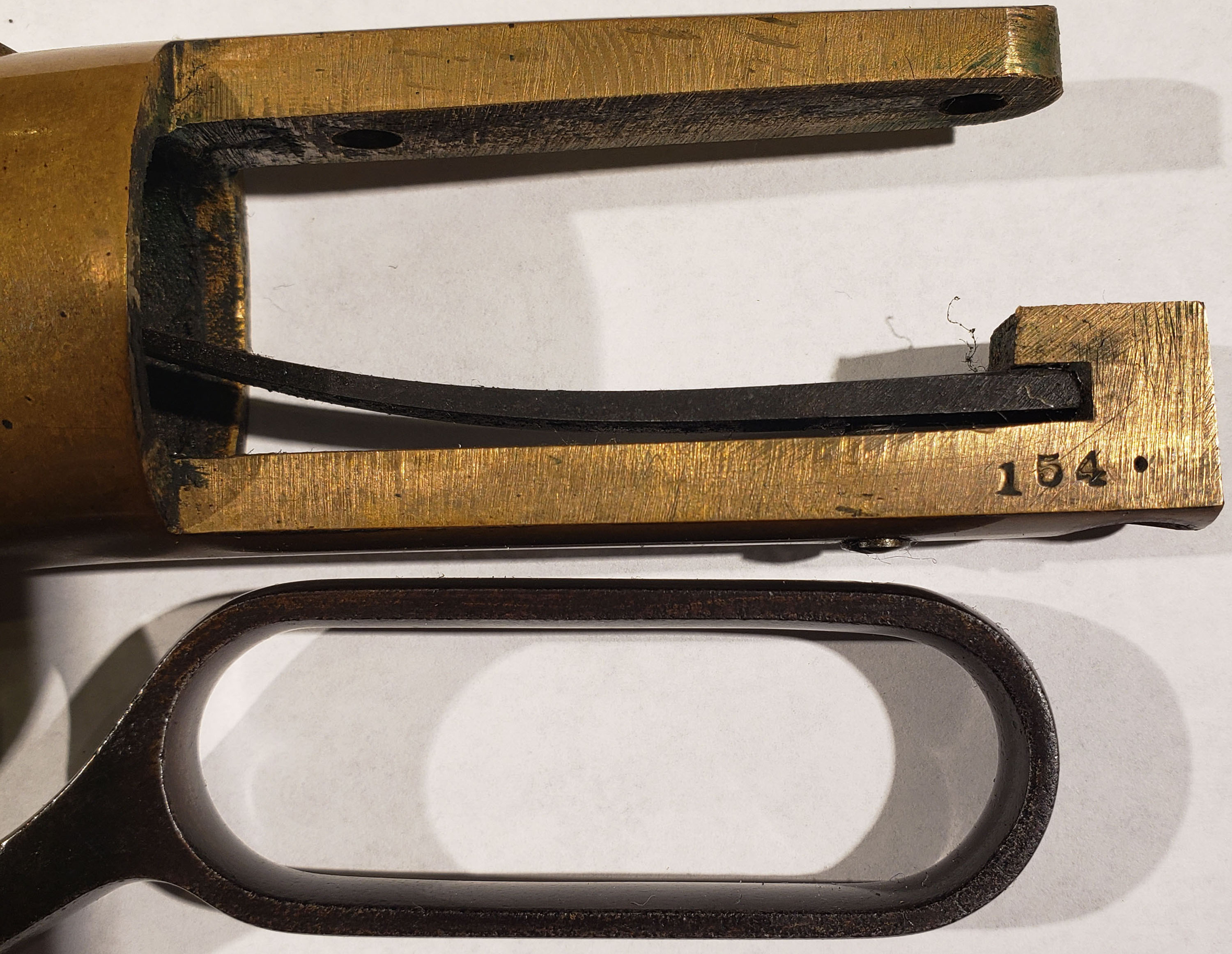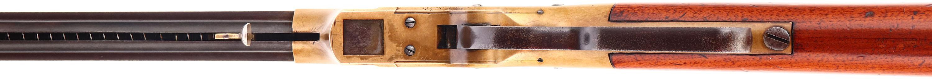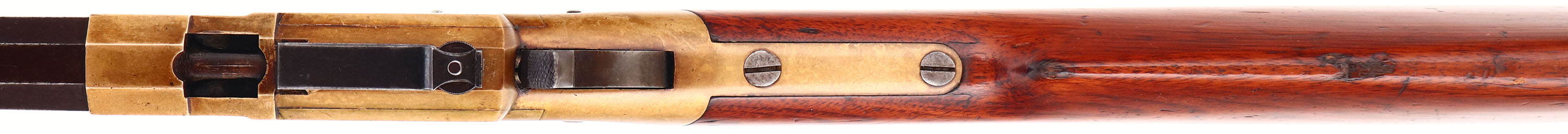 FANTASTIC Volcanic Lever Rifle, .41 Volcanic., MFG. 1857, SN: 154, Lever Action Rifle. This Volcanic Lever Action Carbine was manufactured by the New Haven Arms Company c. 1857. The diminutive carbine has a 16 1/2-inch barrel with integral 20-shot magazine. The barrel has a nickel-silver front sight blade & blue finish, which has toned to a smooth & even plum brown patina. Some light pitting on the barrel. The top flat is stamped: ''NEW HAVEN CONN. PATENT FEB. 14. 1854'' in one line. The rifle has a brass receiver & crescent buttplate. The receiver has a dove-tail mounted rear sight, with thumb-wheel elevator. The rear sight, bolt & top of the cartridge elevator are fire blue. The hammer has deep, borderless, hand-cut knurling on the spur. The hammer, trigger,& lever are color casehardened. The straight grain, American walnut stock has a high polish varnished ''piano'' finish which remains very good, with minor scuffs, scrapes, & contusions. The serial number is stamped: (1) on the lower left side of the receiver tang, (2) the inside of the buttplate, and (3) shanks of the hand fitted buttplate and tang screws . All of the visible SN's match. Bore is good, with areas of pitting amongst strong rifling. The New Haven Arms Company manufactured approximately 1,000 carbines, with 16 1/2, 21 & 25-inch barrels, between 1857 & 1860. Volcanic carbines are rare & historically significant firearms. The revolutionary combination of ''rocket-ball'' primed cartridge, self-cocking toggle action & integral spring loaded magazine was a huge advance in firearms design. When combined with reliable rimfire & centerfire cartridges, the Volcanic action served as the basis for the Henry rifle & Winchester Model 1866, 1873 & 1876 rifles & carbines. This very early 3 digit SN example appears in excellent original condition & would certainly be the centerpiece of most historical gun collections. * Antique, No FFL Req. - Value: 45000 to 65000