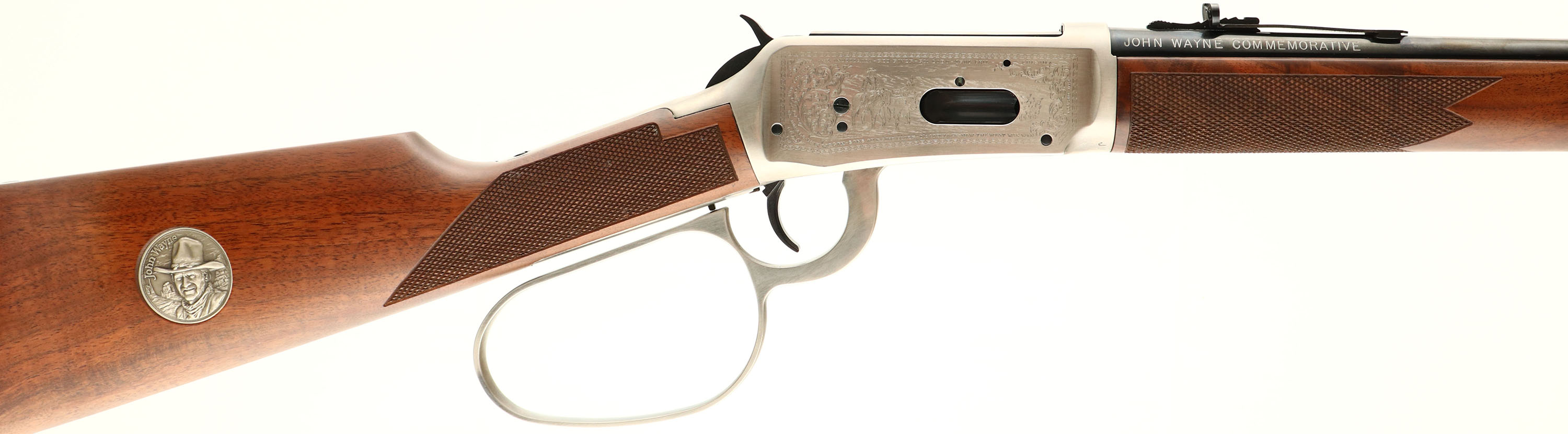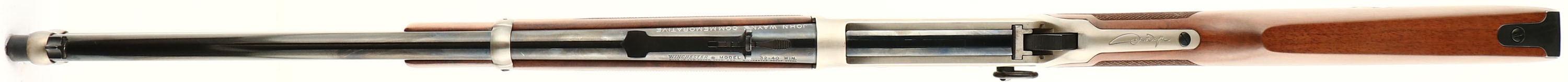 BOXED Winchester, Model 94 JOHN WAYNE SADDLE RING CARBINE Commemorative, .32-40 Cal., MFG. 1981, SN: JW 9099, Lever Action Rifle, 18'' barrel, Full Mag. The factory checkered wood stocks are mint, along with the factory finish. The original metal blue finish is 99%, except on the belly of the receiver forward of the lever where there is some flaking of the finish. The satin silver finished receiver is very good, but the left side of the receiver does have spotty areas of corrosion from improper storage. Also satin silver finished large lever loop & barrel bands, which are excellent. Bore is excellent & bright. Inlaid John Wayne medallion in right side of stock. Factory sights. Carbine style metal buttplate. Blued saddle ring has pittting. Looks unfired. Comes in factory styrofoam box, with owner's manual, booklet, hang tag & outer sleeve. Only 49,000 produced. A popular commemorative collectible. FFL or C&R Req. - Value: 1000 to 2000