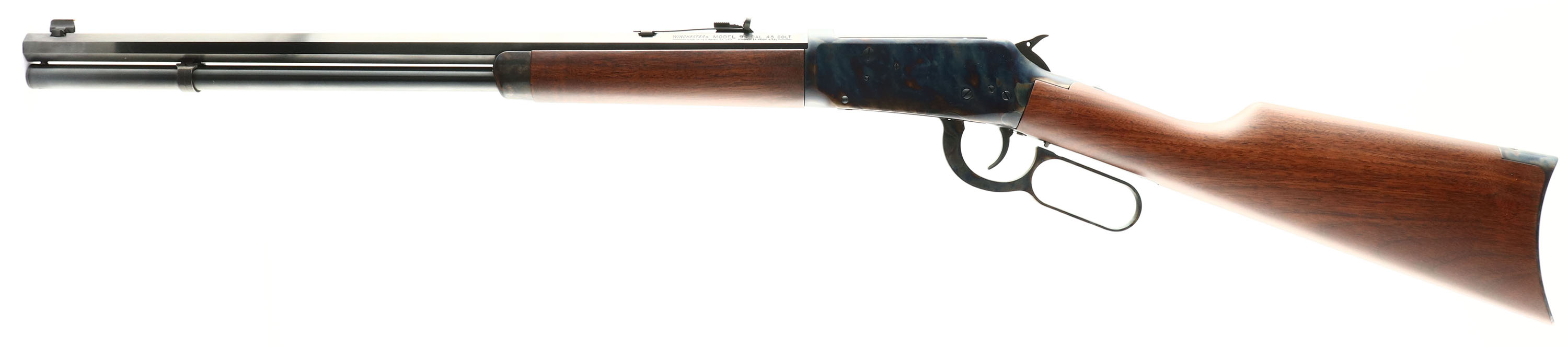 BOXED Winchester Model 94 Trails End Short Rifle, CAL: 45 COLT, MFG: Modern, SN: 6549668, Lever Action Rifle, 20'' Octagon barrel, Full mag. The original straight grip wood stocks are excellent, with no handling marks to the original finish. The original metal blue finishes are 99%+, while the case-hardened receiver, lever, buttplate & forend cap all display vivid case-colors. Bore is excellent. Barrel holds an adjustable rear elevator sight & elongated blade front sight. Buttstock carries a smooth, crescent metal buttplate. This firearm is basically new, with SN matching box, paperwork & hanging tag. FFL Req. - Value: 1400 to 1800