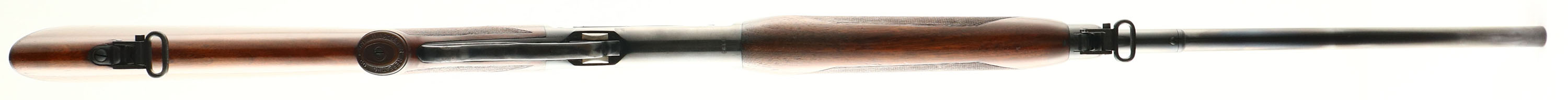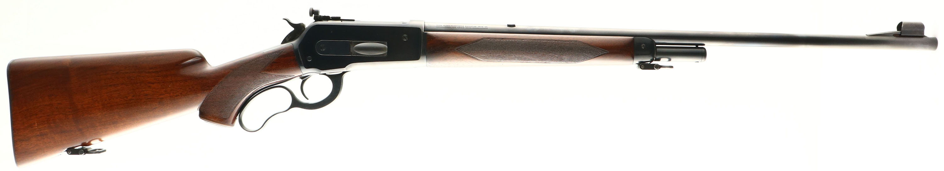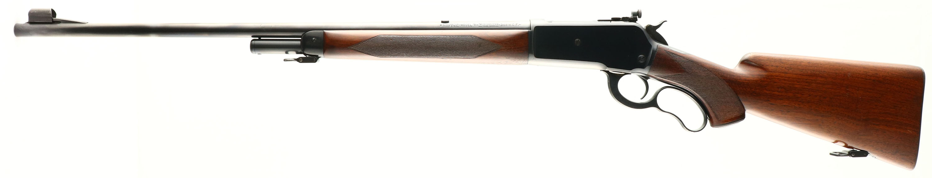 Winchester, Model 71 Deluxe Long Tang, marked 348 W.C.F., MFG. 1936, SN: 9198 (2nd Year Production), Lever Action Rifle, 24'' Round barrel, 2/3 tube mag holds 4 cartridges. An improved model 1886, with just 47,254 made & only 16,900 as Long tangs, & fewer deluxe models, which are in high demand amongst collectors & command premium values. The checkered & capped pistol grip wood stocks are excellent, solid & original. The stocks carry the original finish. There is a small glue repaired corner chip at the upper left shoulder of the wrist & very few other minor scuffs or contusions. The original metal blue finish is 95% on barrel & mag., 90% on receiver, with loss due to carry wear on the belly. Factory upgraded with the rare 100 & 200 yard adjustable breech bolt peep sight, blank filled rear dovetail & front ramp hooded sight. Factory checkered metal buttplate. Excellent bore. Factory sling mounts, with swivels. A rare Winchester in the most collectible caliber & with the desirable long tang, breech peep & deluxe checkered wood. Excellent collectible. FFL or C&R Req. - Value: 3000 to 5000