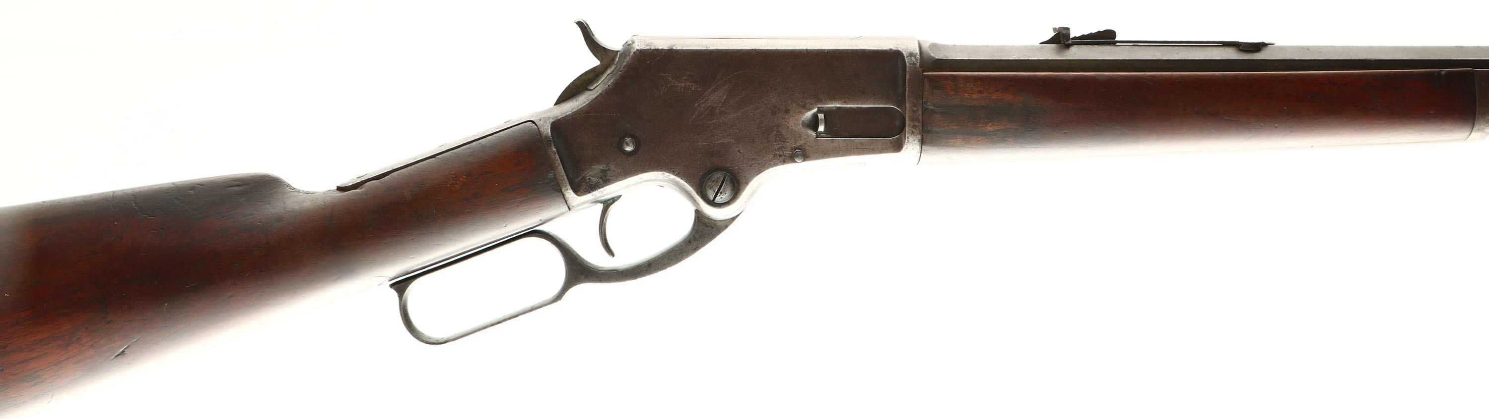 Marlin, Model 1881 Burgess, 38-55 Cal., MFG. 1887 (Antique), SN: 17397, Lever Action Rifle, 24'' Octagon barrel, Full mag. The original wood stocks are good & solid. The finish has darkened with age, use & oiles. There are a few 1'' hairline cracks emanating from the lower tang. The foreend has a couple of 2'' crack repairs on the right side. The stocks also have several small to minor contusions, scratches or scrapes. The metal surfaces have worn to a mix of gun metal gray, brown patina & remaining blue, with most remaining coverage found on the barrel. Barrel carries the original adjustable rear & an elongated half moon blade front sights. Bore is fair, but with lots of roughness & scarring amongst strong rifling. Stock carries a crescent metal buttplate. Action remains tight & smooth. With approximately 20,000 produced in all calibers, these are fairly rare in any found condition. Antique No FFL Req. - Value: 1000 to 2000