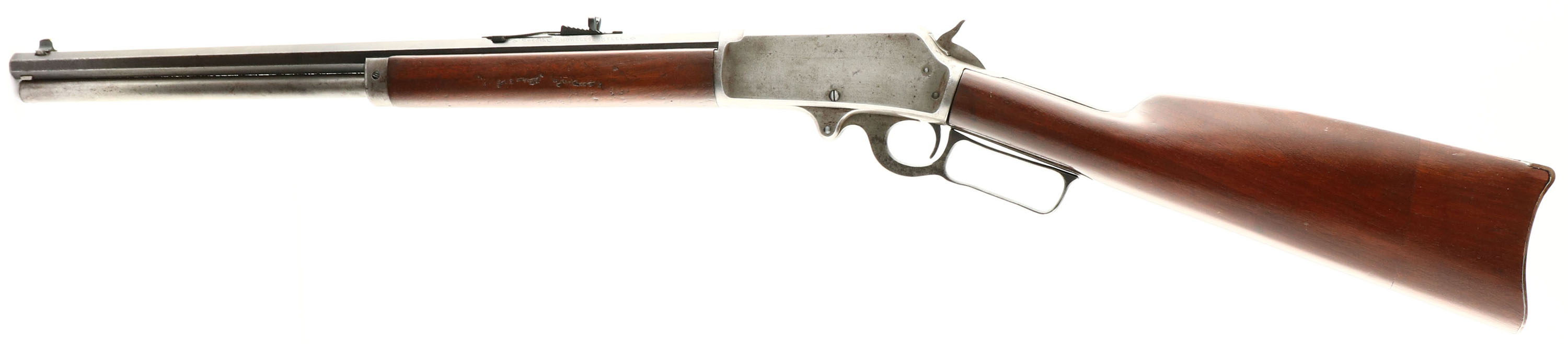 Marlin, Model 1893 Short Rifle (Carbine), marked 30-30 Cal., MFG. 1901, SN: 222399, Lever Action Rifle, 20'' Octagon barrel, Marked ''SPECIAL SMOKELESS STEEL''. Full mag. The wood stocks are good & solid, but the stock is a combination of two stocks with the back 3'' of the buttend having been added to stock to restore the original look & length, which was likely cut short at one time. The stocks were then sanded & refinished, with few minor scrapes, scratches & contusions remaining. The metal surfaces has worn mostly gun metal gray, with thin remnants of orginal blue remaining in the more protected areas of the barrel. Barrel carries an updated Marbles adjustable rear sight & tall blade front sight. Bore is good, but with roughness amongst strong rifling. The stock carries the original carbine style metal buttplate. The lever has some bend & denting to its shape. Action remains tight & smooth. This would make a fun to shoot or hunt with short rifle. FFL or C&R Req. - Value: 400 to 800