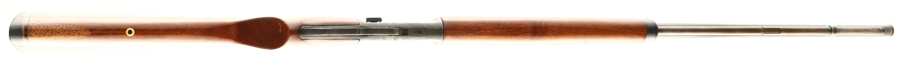 Marlin, Model 39, .22 S. L. LR Cal., MFG. 1945, SN: B6804, Lever Action Rifle, 24'' Round barrel, Full mag. The original flat pistol grip wood stocks are fair, having been sanded & refinished. There is a 1/2'' x 1'' missing corner chip at the left side of the wrist & a 2'' replaced toe break repair. There are minor contusions, scraps & scuffs remaining. The metal blue finish on the barrel & mag tube has worn to gun metal gray, with a thin brown patina, while the case-hardened receiver has also worn or faded gray with some remnants of case-colors in protected areas. Bore is excellent. The barrel carries an adjustable rear & blade front sight. Stock carries a thin serrated black rubber recoil pad. Marlin bullseye located in belly of the stock. Tight action. FFL or C&R Req. - Value: 300 to 600