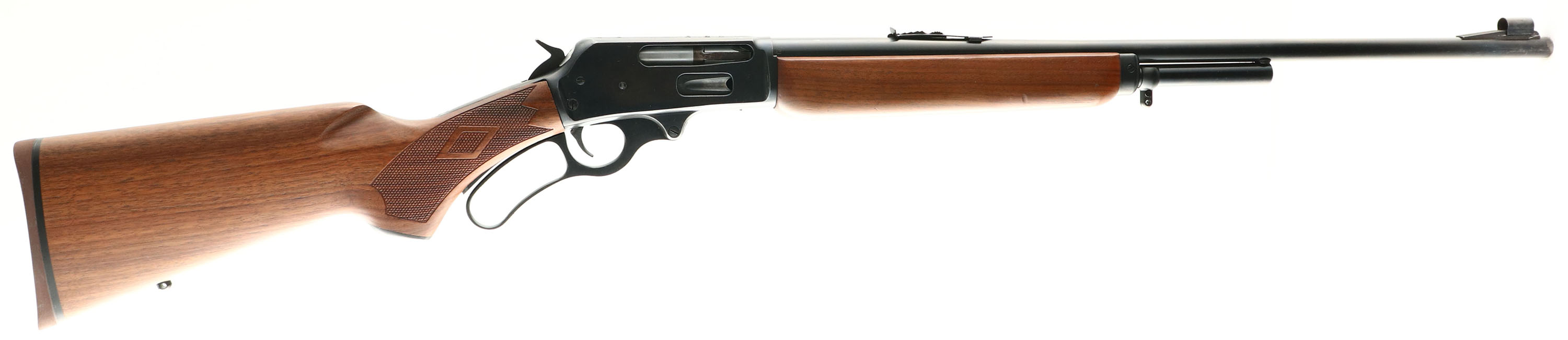 Marlin, Model 336A, CAL: 35 Rem, MFG:1979, SN: H21929, Lever Action Rifle, 23 3/4'' round barrel, 2/3rds mag. The checkered & capped pistol grip wood stock appears to be an updated factory replacement, which is excellent, with no handling marks to the original finish. The forearm appears to be the original smooth grip, which is excellent, with several small contusions to the excellent original finish. The metal blue finish rates 90% overall. The top of the receiver has five modern screw filled holes for potential scope mount. The barrel carries an adjustable rear & ramp elevated hooded blade front sights. Bore is excellent, with strong rifling. Stock carries the original Marlin solid rubber recoil pad. Factory trademark bullseye in belly of the stock. Sling studs. A solid lever action hunting rifle. FFL Req. - Value: 400 to 800