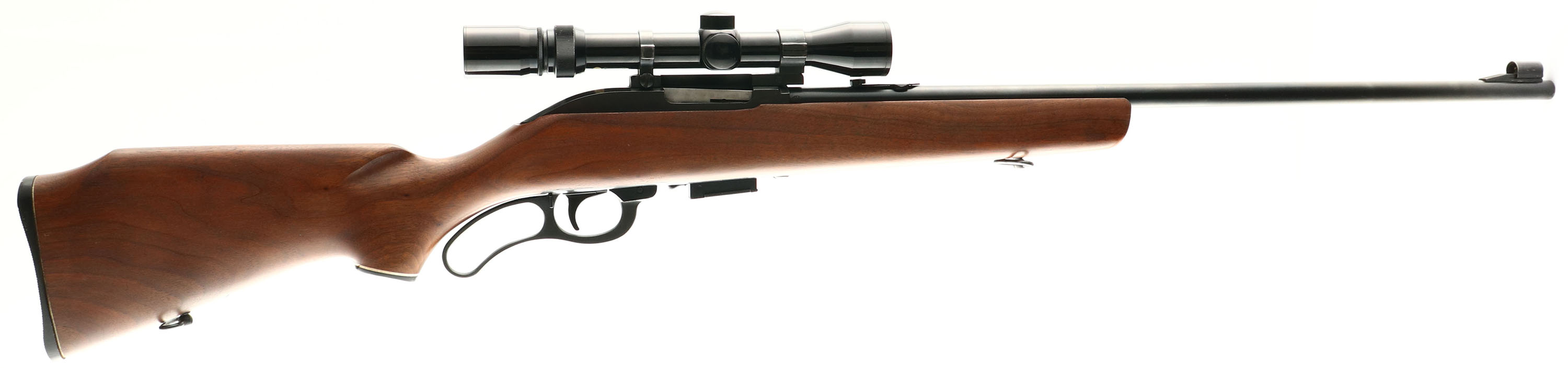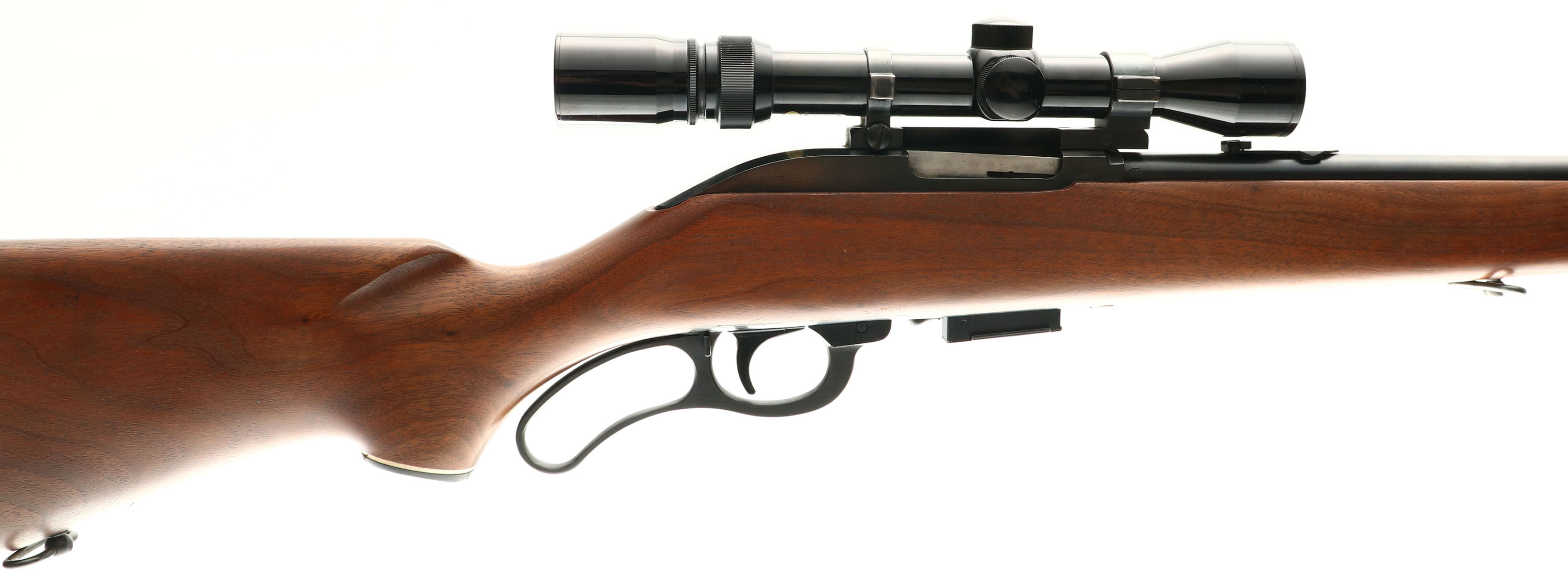 Marlin, Model 62 Levermatic Carbine, CAL: 256 WIN MAG, CAL: 1963-69, SN: 6707, Lever Action Rifle, 24'' Round barrel. The capped, flat pistol grip Monte Carlo style wood stock is excellent. It displays very few light surface scratches or handling marks to its excellent original finish. The metal blue finish rates 95% overall. The Micro Grooved bore is excellent. The rifle comes fitted with a Banner by Bushnell 3x-8x scope, while the barrel has a Marbles folding leaf rear & a ramp hooded blade front sight. Buttstock carries the original Marlin marked checkered black plastic buttplate. Sling swivels. Missing the Marlin trademark bullseye from the belly of the stock. Original detachable mag. An original & excellent overall example. FFL or C&R Req. - Value: 600 to 1200