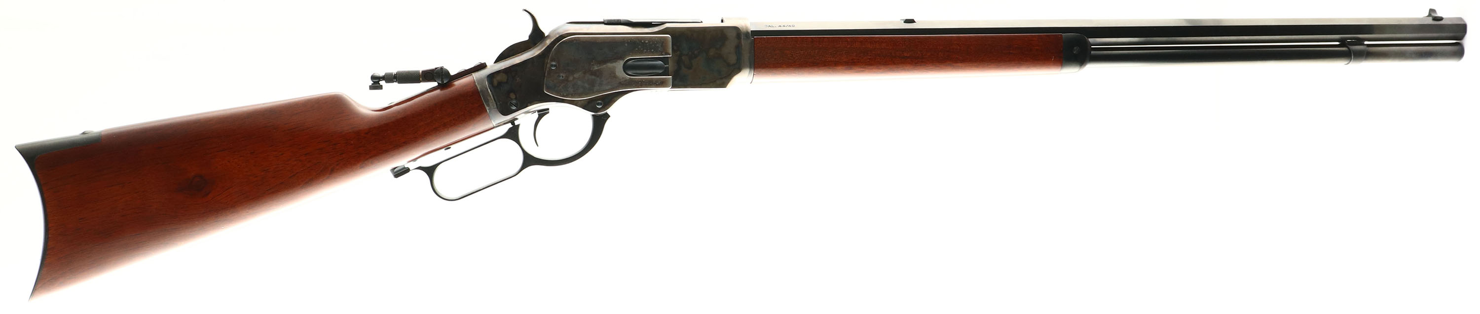 Uberti, Model 1873 Rifle, CAL: 44-40, MFG: Modern, SN: 53282, Lever Action Rifle, 24'' Octagon barrel. The original straight grip wood stocks are excellent, displaying very few minor handling marks the excellent original finish. The high polished blue finish on the barrel & tube rates excellent 99%. The receiver displays vivid case-colors. Bore is excellent, near mint. The receiver is fitted with a flip-up tang sight, while the barrel holds a blank filed rear dvetail & small blade front sight. Stock carries a crescent metal buttplate. A fantastic reproduction of an American classic. FFL Req. - Value: 1000 to 1800
