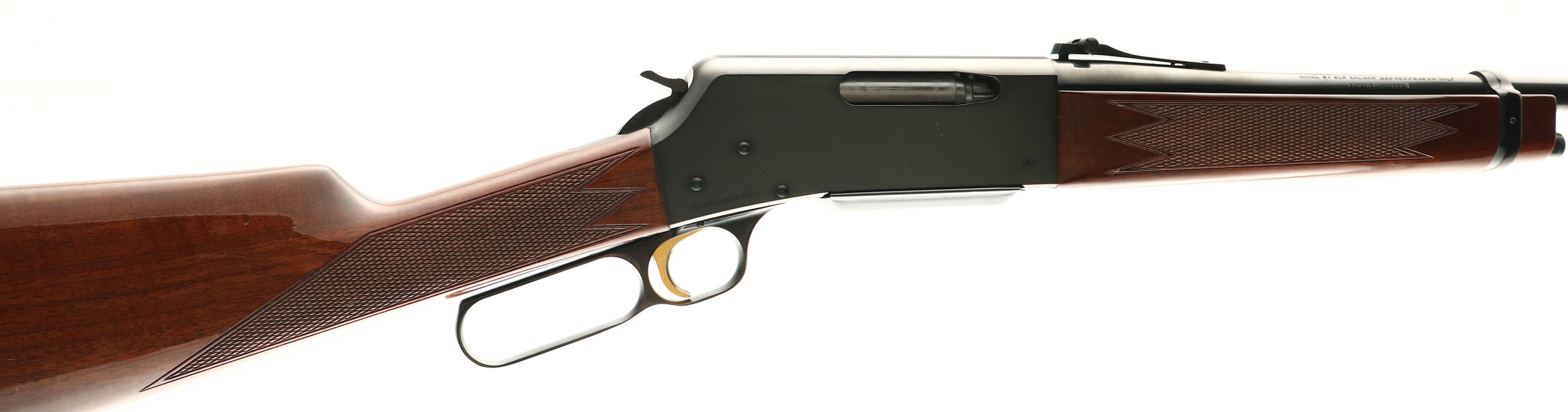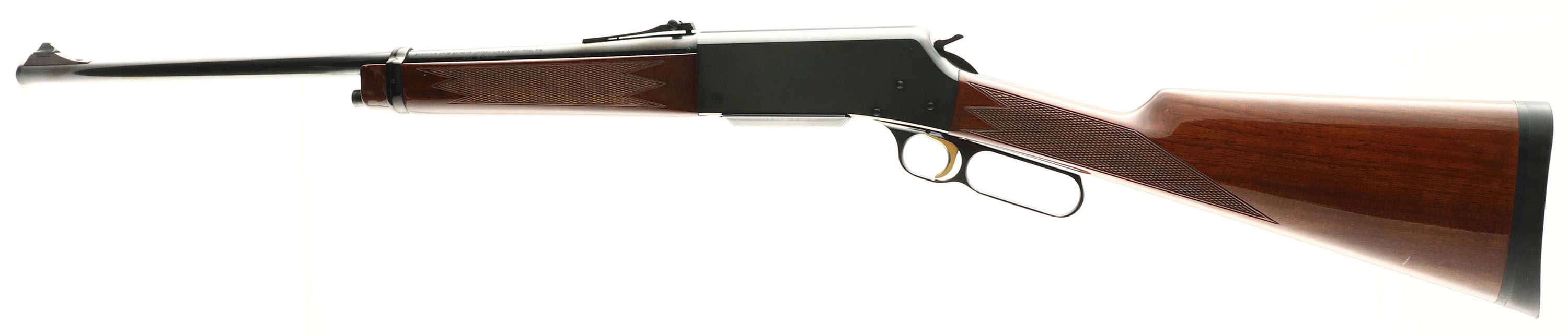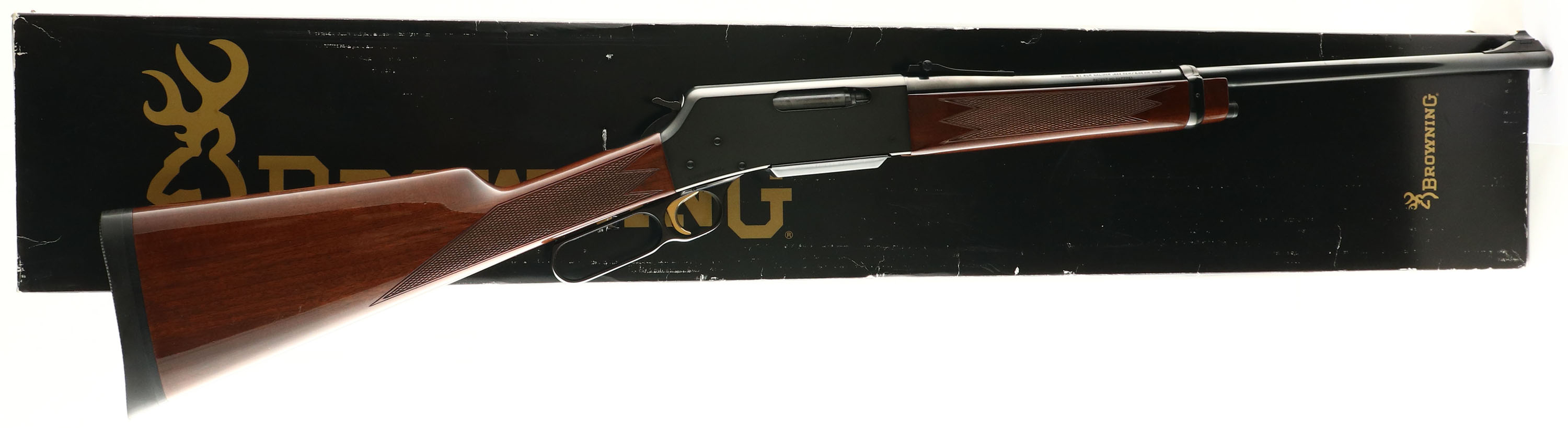BOXED Browning, Model BLR 81(Short Action), Marked .223 REM / 5.56 mm, Cal., MFG. 1991, SN: 01067NZ227, Lever Action Rifle, 20'' round barrel, Detachable 4 round box mag. Original factory checkered & straight grip walnut stocks are excellent, with excellent original high gloss finish. There are a couple of small scratches to the finish of the stock. The original high gloss metal blue finish rates 99% overall. Bore is excellent. Factory rear & front sights. Original black solid recoil pad. Gold Trigger. Detachable mag. Rifle comes in correct SN matching box, with packaging & booklet. A nearly NIB, old stock, Browning lever. FFL Req - Value: 1000 to 1400