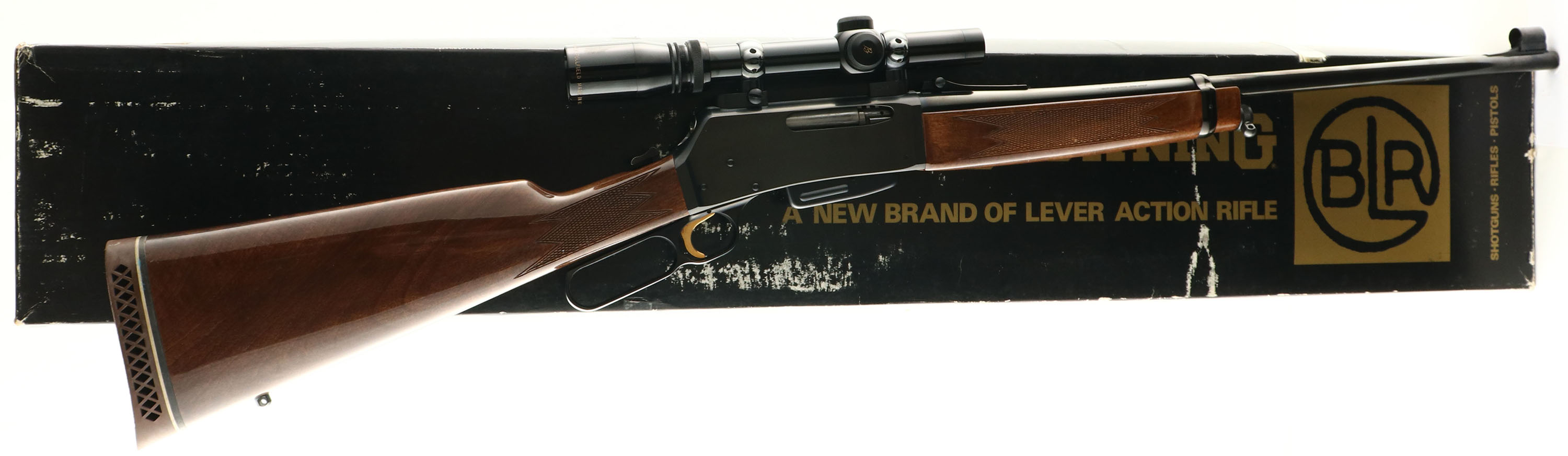 Boxed Browning, Model BLR 81 Lightweight, .358 Only Cal., MFG. 1980, SN: 30212PM127, Lever Action Rifle, 20'' round barrel, Detachable 4 round box mag. Original factory checkered straight grip wood stocks are excellent, with light use wear to the excellent original finish. The original metal blue finish on the barrel & receiver rates 99%. Bore is excellent. The receiver is mounted with a period Burris Fullfield 1 3/4X-5X scope, while the barrel carries the original factory rear & front sights. The stock carries the original Browning ventilated recoil pad. Gold Trigger. Sling studs. Rifle comes with the correct SN matching box, with packaging & booklet. An overall excellent Browning lever. FFL Req - Value: 800 to 1200