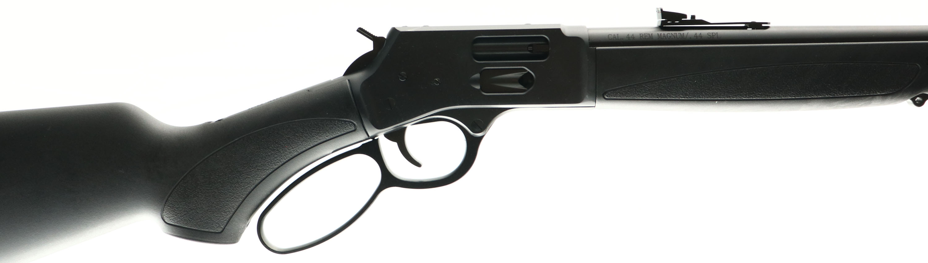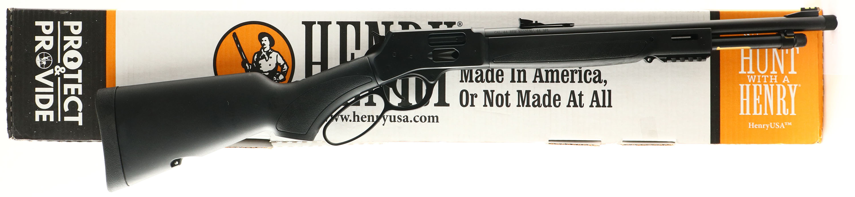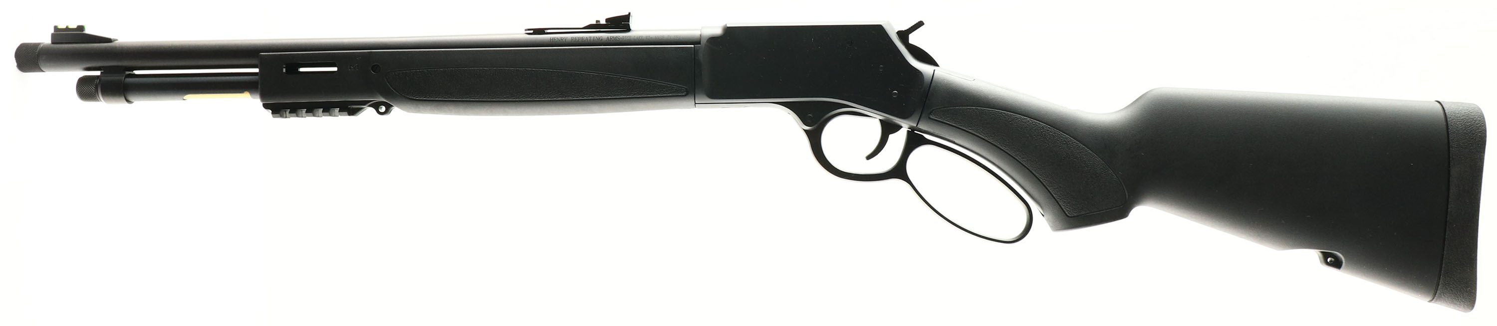 BOXED & NEW Henry Repeating Arms, Big Boy Model X Carbine, CAL: .44 Rem Magnum / .44 SPL, MFG: Modern, SN: XBBS11599, Lever Action Carbine, 17.4'' barrel, 1:20'' Twist Rate. Full Mag. The original flat pistol grip synthetic stocks are excellent, with no handling marks. The metal black finish rates 100% overall. Bore is mint. Barrel carries factory fiber optic sights. The receiver is drilled & tapped for installing a picatinny rail & other optics. Threaded barrel which allows the use of modern suppressors, 5/8x24. Mag tube or side gate loading. Large Loop Lever. Has two modular M-LOK slots at the 3 & 9 o'clock positions, with a picatinny rail at the 6 o'clock position. Buttstock carries a solid rubber kickpad, LOP 14''. Sling studs. A new Big Boy, which comes in the original box, with booklet, paperwork & hang tag. FFL Req. - Value: 800 to 1000