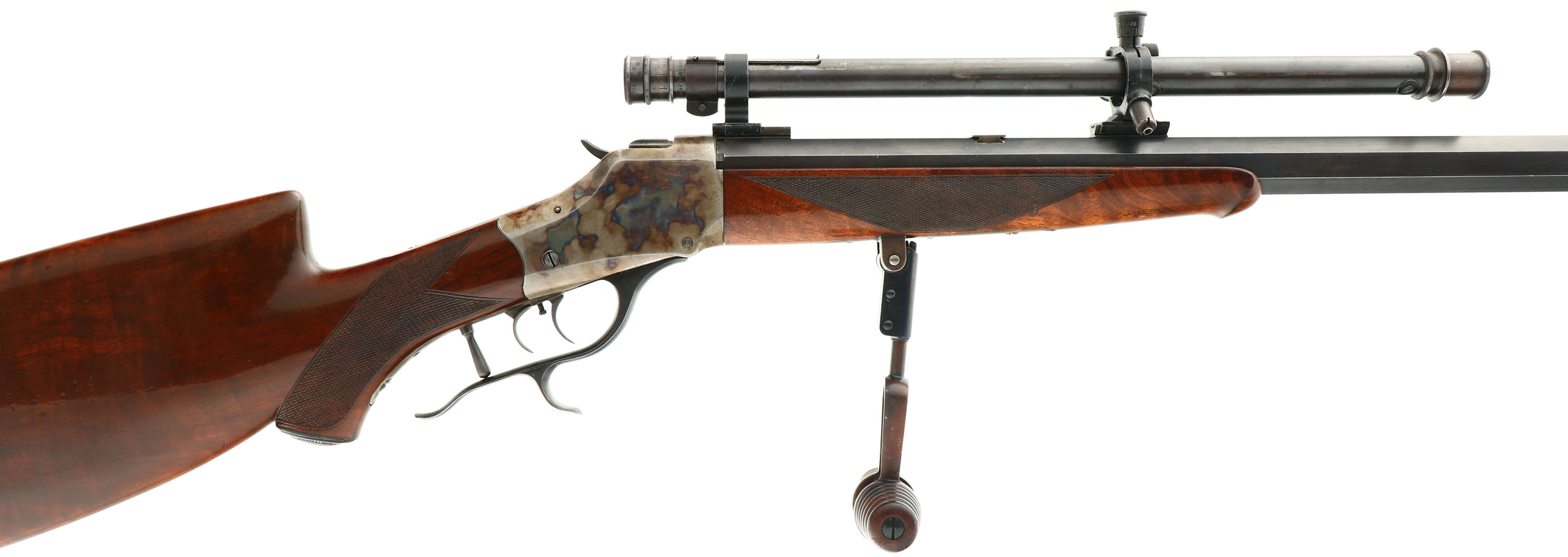 Winchester, Model 1885 Schuetzen Rifle, .32-40 Cal., MFG. 1896, SN: 75112, Lever Action Single Shot Rifle, 29 1/2'' Full Octagon #4 Heavy barrel. This Rifle presents as a custom built replica of the factory special order Deluxe Schuetzen rifle. According to the Cody Museum Winchester Factory Records SN 75112 started life as a standard rifle in 32 WCF, with a 28'' #1 weight barrel. The rifle has since been customized & carries a number of features consistent with the deluxe Schuetzen models. It carries a XX 1st style Swiss cheeked stock, with a steep rise top comb, deluxe checkering, capped pistol grip & a nickeled Swiss Schuetzen buttplate. The Schnabel style forearm has an ebony inlay in the tip, deluxe checkering & a folding palm rest. Both stocks display fantastic grain & the majority of the high gloss finish. The are a handful scuffs & light handling marks as well as a small repair to the cheek edge & a 6'' thin finish level scratch on the right side of the stock. The metal blued finish on barrel rates at 95%, while the case-hardened receiver displays fantastic case colors, The lever has had the spur very nicely added to an original 1885 lever that has also been reshaped. The rifle carries double set triggers which work correctly. The bore rates excellent. Barrel is mounted with a 16'' Winchester A5 scope on Winchester mounts, a blank filled rear dovetail & silhouette front sight. The barrel is marked ''32-40'' on top of barrel flat & under forearm. The barrel is also marked with a ''4'' for barrel weight ahead of forearm & under forearm. It is also stamped with the assembly # ''6159'' under the forend. The side of left tang of the receiver is marked with ''XX'' & ''6159''. The buttplate is also stamped ''6159'', as is the buttstock on the buttend & upper channel. This rifle has a wonderful appearance & remains highly collectible as presented as a deluxe Schuetzen 1885 rifle. Antique, No FFL Req. - Value: 3000 to 6000