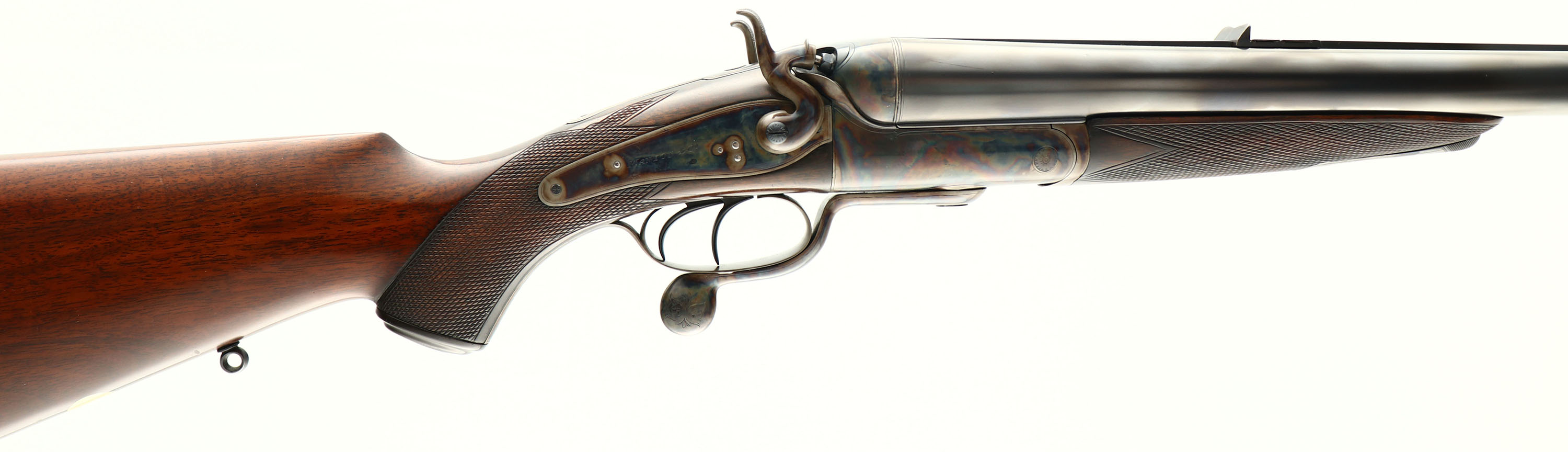 FANTASTIC CASED MANTON & CO., Model Hammer Underlever Sidelock Double Rifle, CAL: 10-BORE, MFG: Antique, SN: 5673, Lever Break Double Shot Rifle, 26'' SxS fluid-steel barrels, with solid flat matted rib, 1 standing & 2 folding platinum-lined express sights engraved for 100, 200 & 300 yards. English walnut stocks, with lever-release splinter forend, bakelite pistol grip cap, classic point-pattern checkering, beaded pancake cheekpiece, sling eye, & vacant initial oval. Finish & condition is excellent with very few handling marks. Border-engraved, case-hardened receiver & sidelocks, with Jones underlever, rebounding locks & no separate safety catch. Case-colors remain vivid. 97% coverage of the rich bluing on carrels. London black powder proved. Tight & with excellent bores. Sling eye, & doll's head extension. 14 3/8'' pull from front trigger to the end of the Silvers red rubber recoil pad. Weight: 14lbs, 5oz. Comes stored in period canvas wrapped trunk case, with brass corners, maker's label & innumerable loading accessories. Investment grade & highly collectible double rifle. An overall excellent & collector/investment grade hand crafted rifle. Antique, No FFL Req. - Value: 10000 to 15000