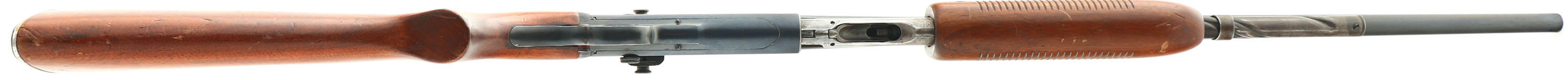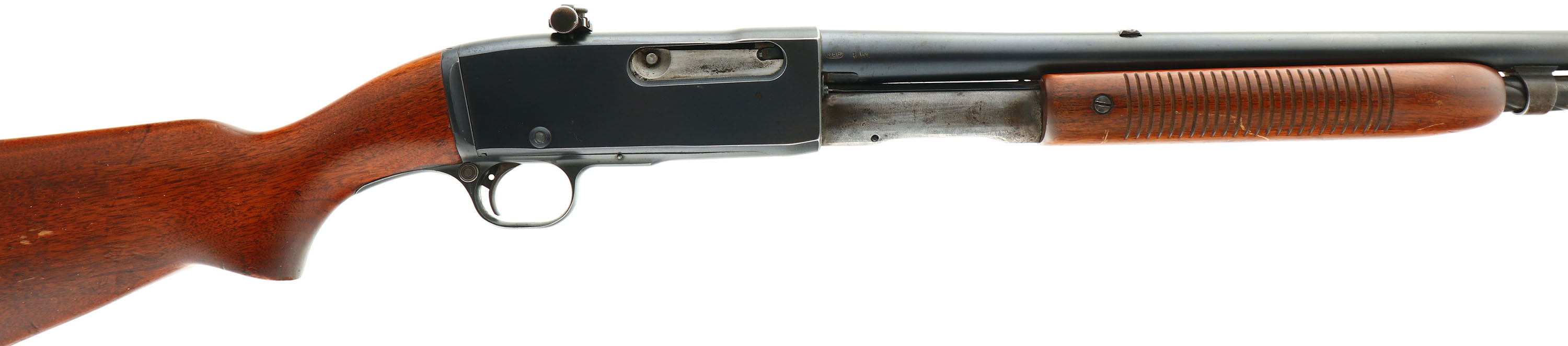 Remington, Model 141 Gamemaster, .35 REM Cal., MFG: 1935-50, SN: 50113. Pump Auction Take-down Rifle, 24'' round barrel. The original flat pistol grip wood stocks are very good & solid. The stocks carry the original finish, but with an added layer of finish on the stock. There are also several small contusions, scrapes & scratches. The original metal blue finish on the barrel & receiver rates 80%, 40% on the mag tube. Bore is excellent. Receiver carries a Lyman 56 side mount receiver sight, while barrel carries a blank filled rear dovetail & blade front sight. Stock carries a Remington serrated metal buttplate. Action is tight & functions well. A nice looking vintage pump hunting rifle. FFL or C&R Req. - Value: 300 to 600