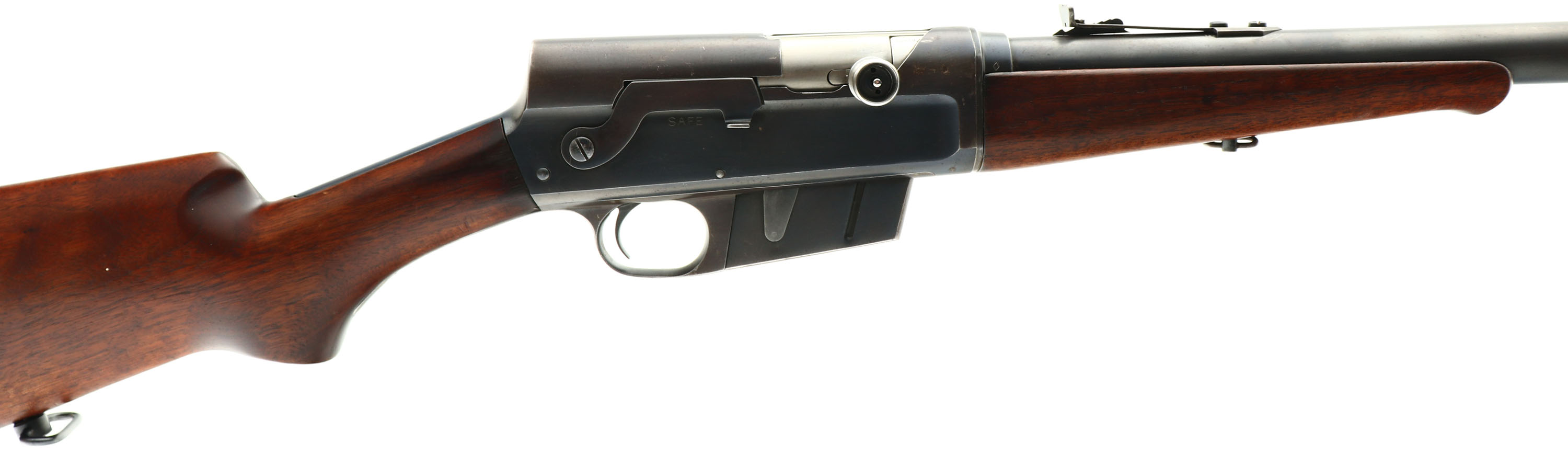 Remington, Model 8, 30 REM CAL, MFG. 1928, SN 56684, Semi-Auto Rifle, 22'' barrel. Straight grip stock are most often found in the early & mid production years, with the round knob becoming more in vogue in the 1910-20's & finally the flat knobs becoming more popular in the late 20's & early 30's. This example is from the late 20's. The original flat knob pistol gripped stocks are excellent stocks. There are very few minor scratches & contusions to the original finish, with some thinning at the belly of the stock & carry points. There are small missing chips in 3 of the 4 corners of where the stock wrist meets the receiver. The original metal blue finish rates 70% overall, with the finish toning a bit gray/plum as it thins, mostly on the receiver. The barrel is fitted with standard ajustable rear & a Lyman front blade sight. Bore is excellent, very bright & clean. Stock carries the popular serrated, bottom tang Remington crescent metal buttplate. 5 rd fixed magazine. Sling loops in the stock & barrel. A high quality rifle, with the popular flat knob stock. FFL or C&R Req. - Value: 700 to 1200