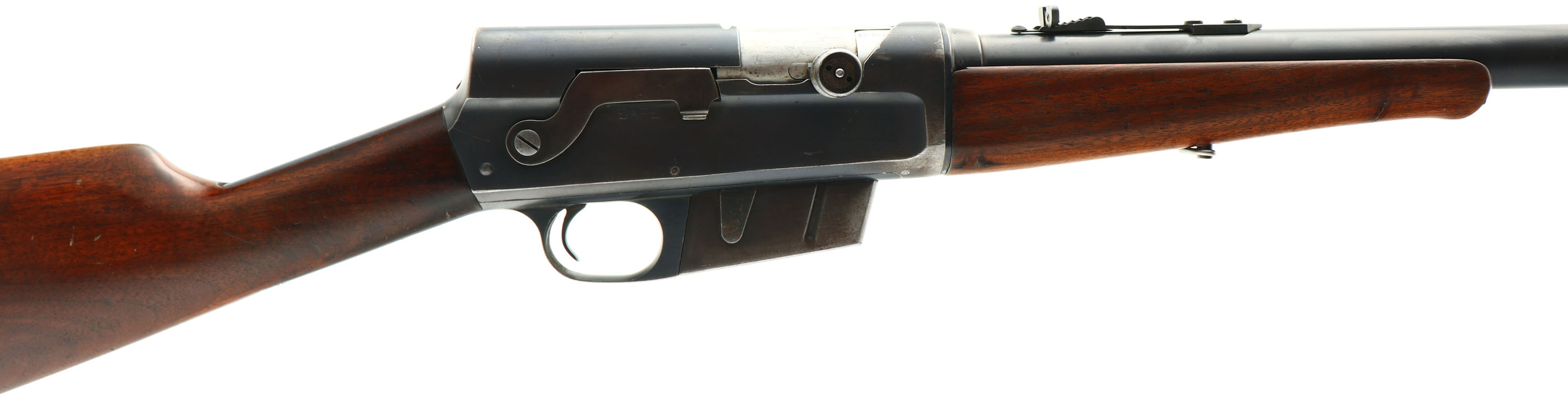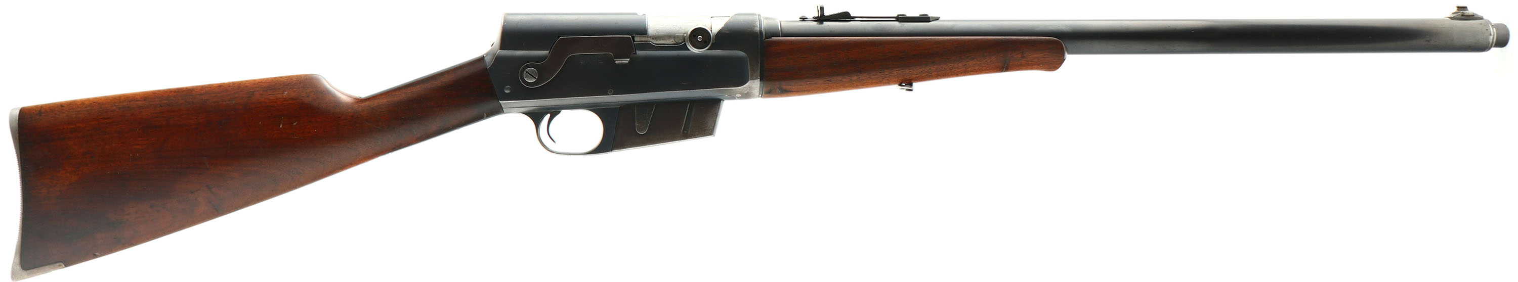 Remington, Model 8, .32 Rem Cal, MFG. 1934, SN: 67248, Semi-Auto Rifle, 22'' barrel. The original straight grip & schnabel forend stocks are excellent, with both carrying the original finish. There are several minor scuffs, scratches & contusions to the wood & finish, with the finish stating to thin. There is a small 1'' crack repair to the back of the forend, that used a spot of fill in the repair. The original metal blue finish rates 80% on the barrel, 70% on the receiver, with the mag showing more loss. Bore is excellent. The barrel carries a Marble's adjustable rear sight & small blade front sight. Stock carries the popular bottom tang, serrated crescent metal buttplate. 5 round fixed magazine. Tight action. Overall, a very nice & original rifle. FFL or C&R Req. - Value: 700 to 1000