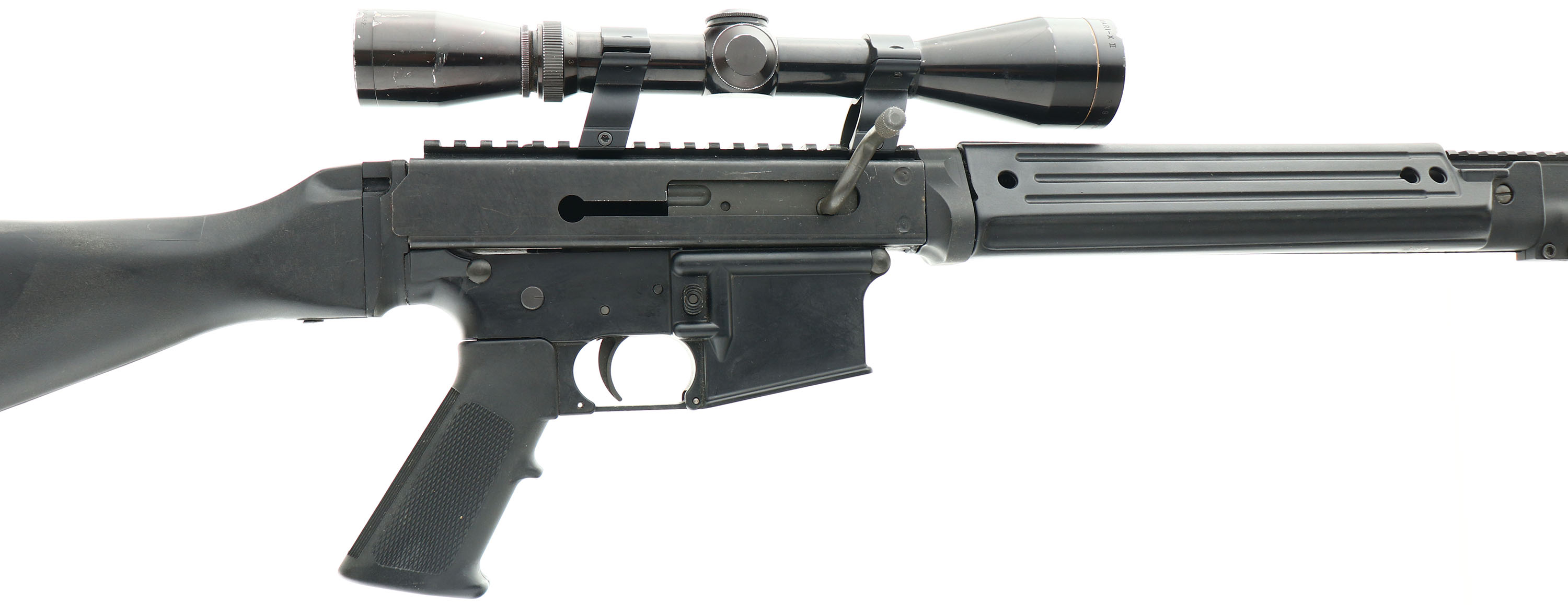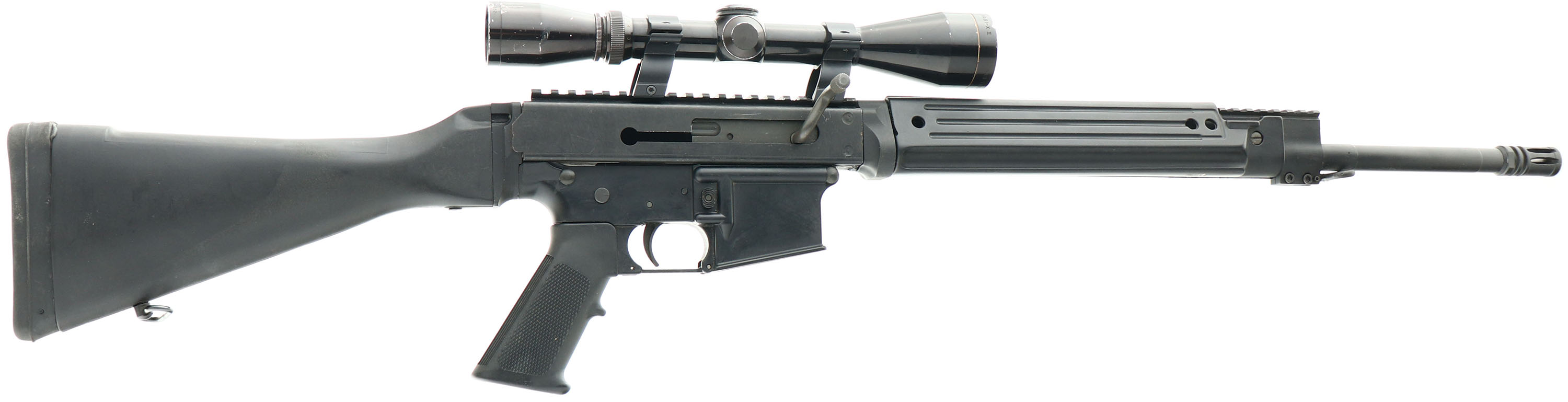 Vulcan Arms, Model: V15 Polymer Series, Cal: 5.56mm NATO, MFG: Modern, S/N: 05080, Semi-auto rifle, 20'' barrel,1:7 Twist. 21 1/2'' with muzzle brake. Polymer lower. The fixed black polymer stock, checkered pistol grip & forend are excellent. The metal finishes rate 95% overall. The receiver carries a Leupold gold ring Vari-X II 3X9 scope mounted on a 8'' picatinny rail. Bore is excellent. The forend/barrel is fitted with a 3'' accessory picatinny rail & sling loop. The stock carries a solid rubber recoil pad & sling loop. No mag. FFL Req. - Value: 400 to 600