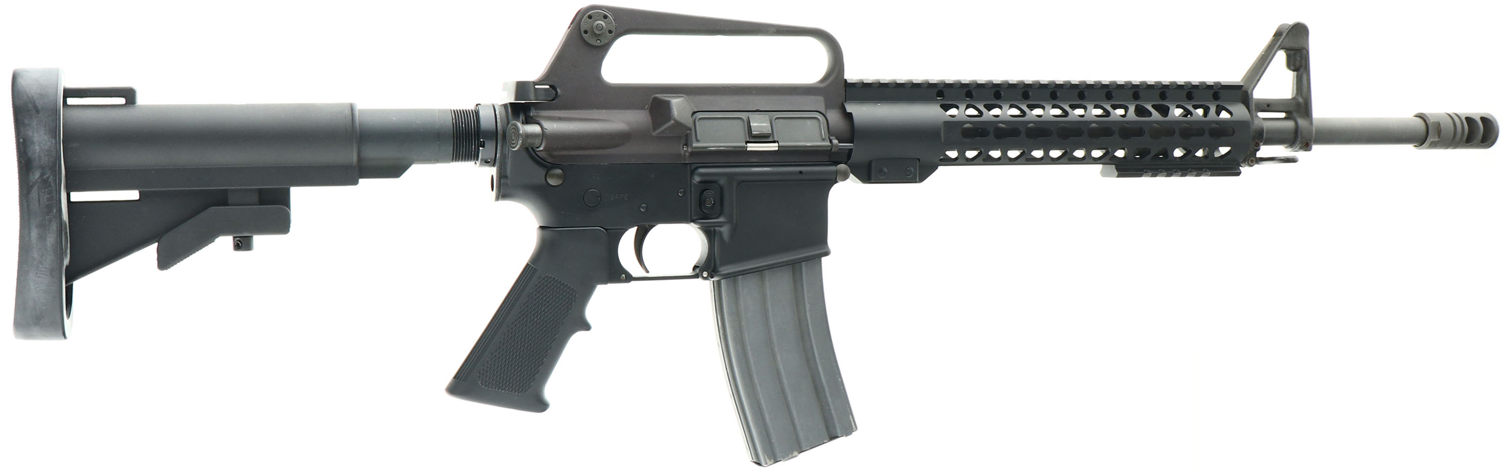 Superior Arms, S-15, CAL: .300 Blackout, MFG: Modern, SN: 005798, Semi Auto Rifle, 16'' barrel, 17 1/2'' with muzzle break. The synthetic checkered pistol grip & 6pt telescoping stock are excellent. The 10'' octagon key-mod handgaurd is excellent, with 10'' picatinny rail on top & 3 1/2'' rails on the bottom & left side. The matte black finish rates 99%overall. Bore is excellent. The receiver carries the fixed A1 carry handle, with height adjusting rear sight. A2 style front sight gas block assembly. Sling loop. 30rnd steel mag. FFL Req. - Value: 400 to 800